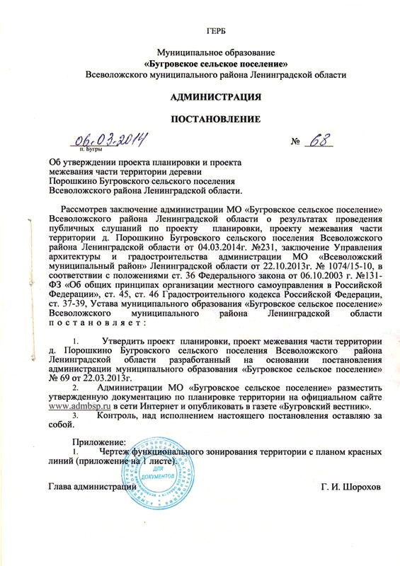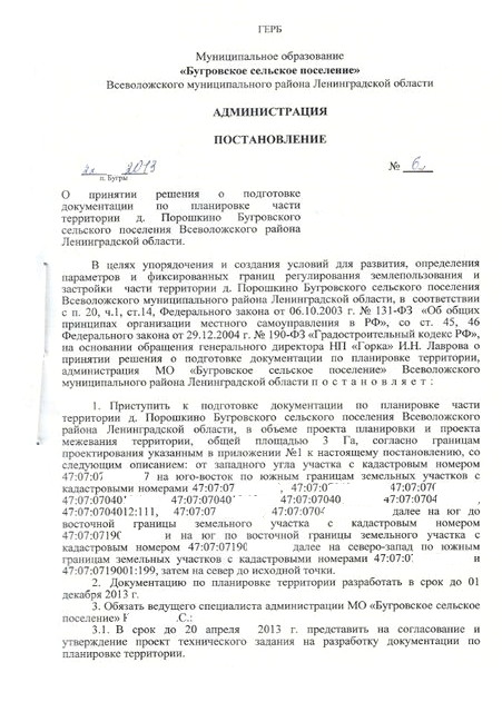 - Для участка разработан проект планировки и межевания территории, утверждённый Постановлением Главы МО Бугровское сельское поселение.