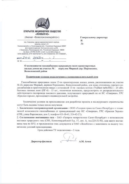 - от “Всеволожскмежрайгаз” о возможности газоснабжения природным газом 13-ти проектируемых жилых домов для нужд отопления, горячего водоснабжения и приготовления пищи с установкой 13-ти газовых котлов “Vaillant turbo TEС”- 24 кВт; бытовых газовых плит (ПГ-4) - 13 шт, от распределительного действующего газопровода высокого давления, получающего природный газ от КС «Севернаяя», ГРС «Красная зорька», проходящего к индивидуальной застройке.