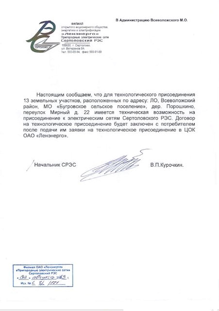 - от Сертоловского РЭС о технической возможности на технологическое присоединение 13-ти земельных участков к электрическим сетям Сертоловского РЭС при условии заключения договора с потребителем после подачи им заявки на технологическое присоединение в ЦОК ОАО «Ленэнерго».