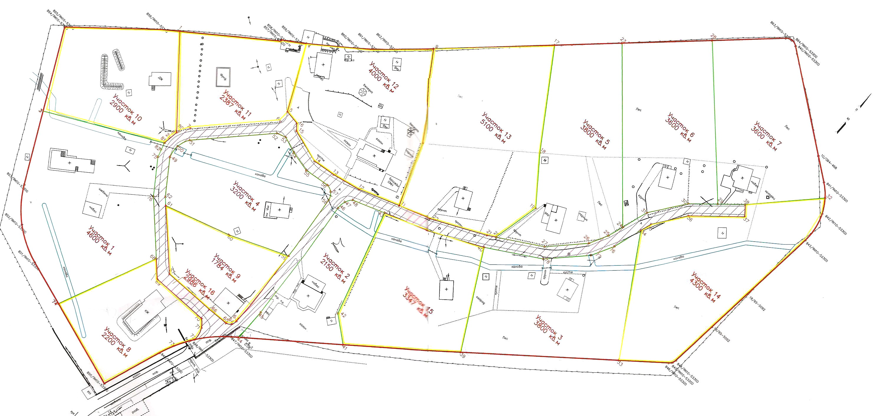 - Территория поделена на 15 участков площадью 38 + 43 + 33 + 36 + 36 и более соток (см.план межевания).