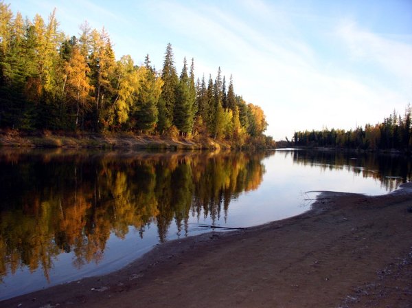 С участка изумительный вид: с одной стороны река, с другой сосновый лес, с третьей вид на озеро Красавица.