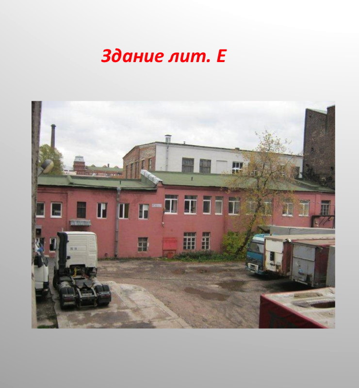 - Нежилые помещения в здании лит. Е: пом. 1Н, 2Н, 3Н, 4Н, 5Н, Л1, Л2, площадь 632.6 м2. Нежилое здание лит. Е является офисно-административным зданием.