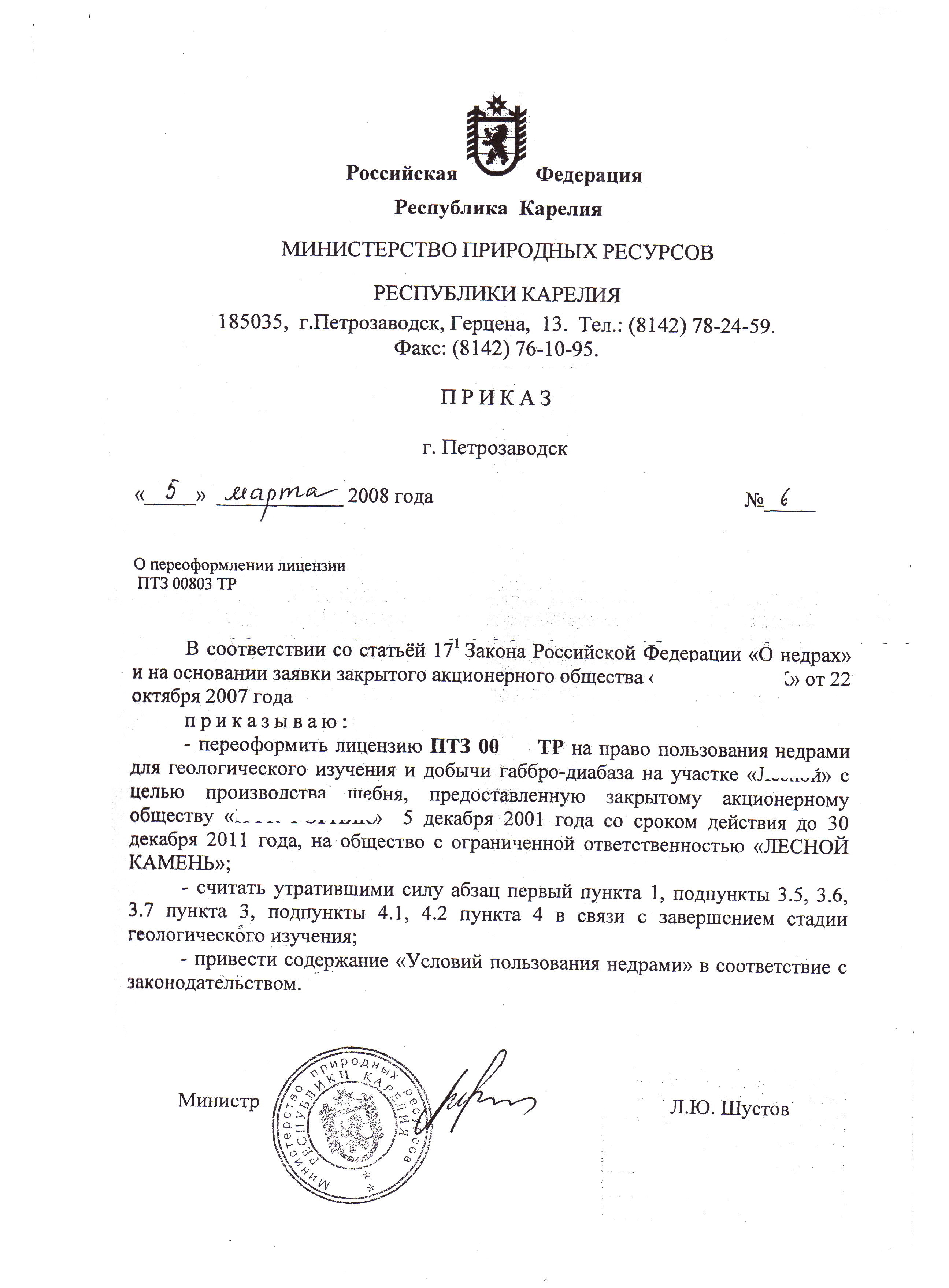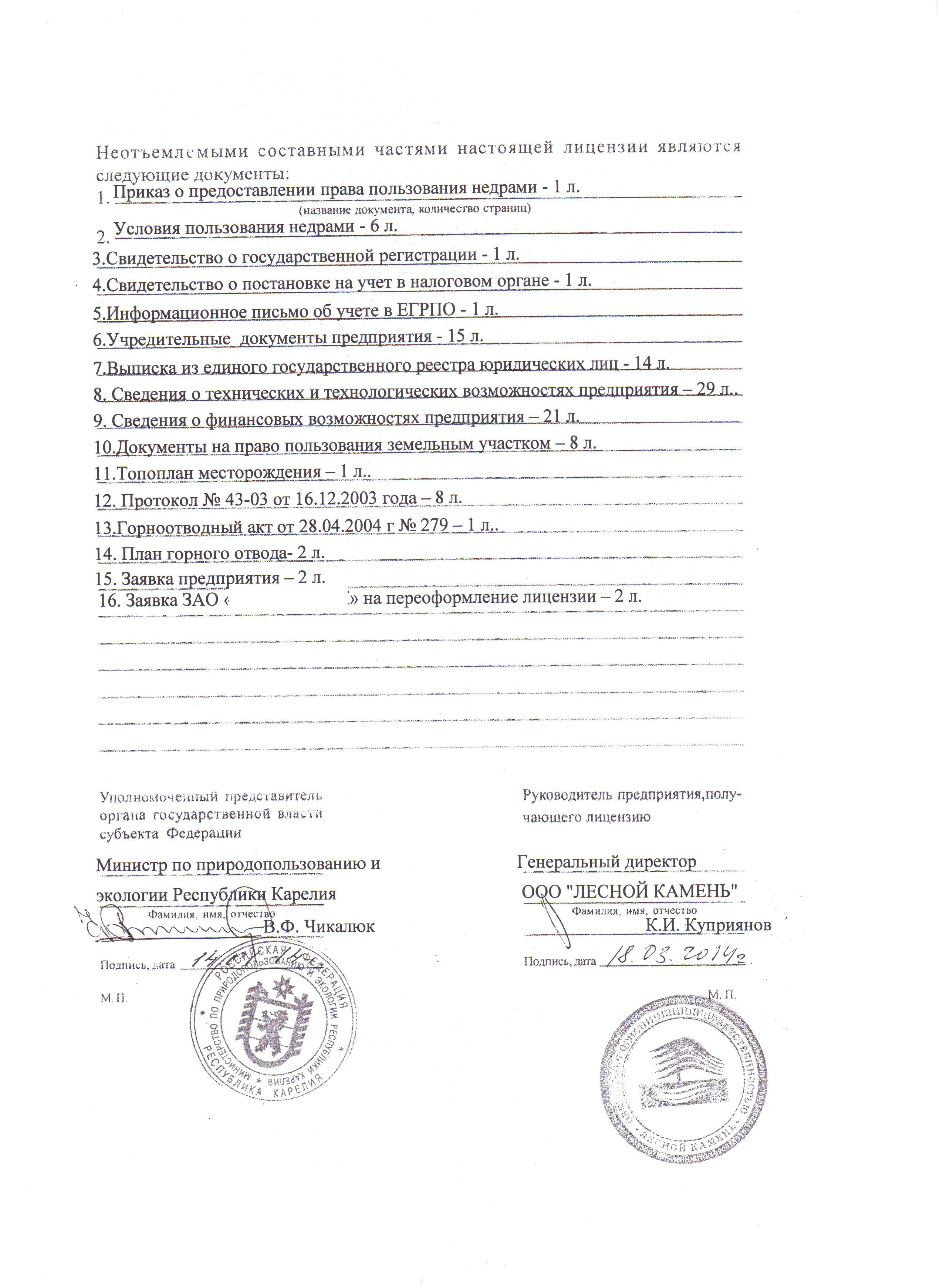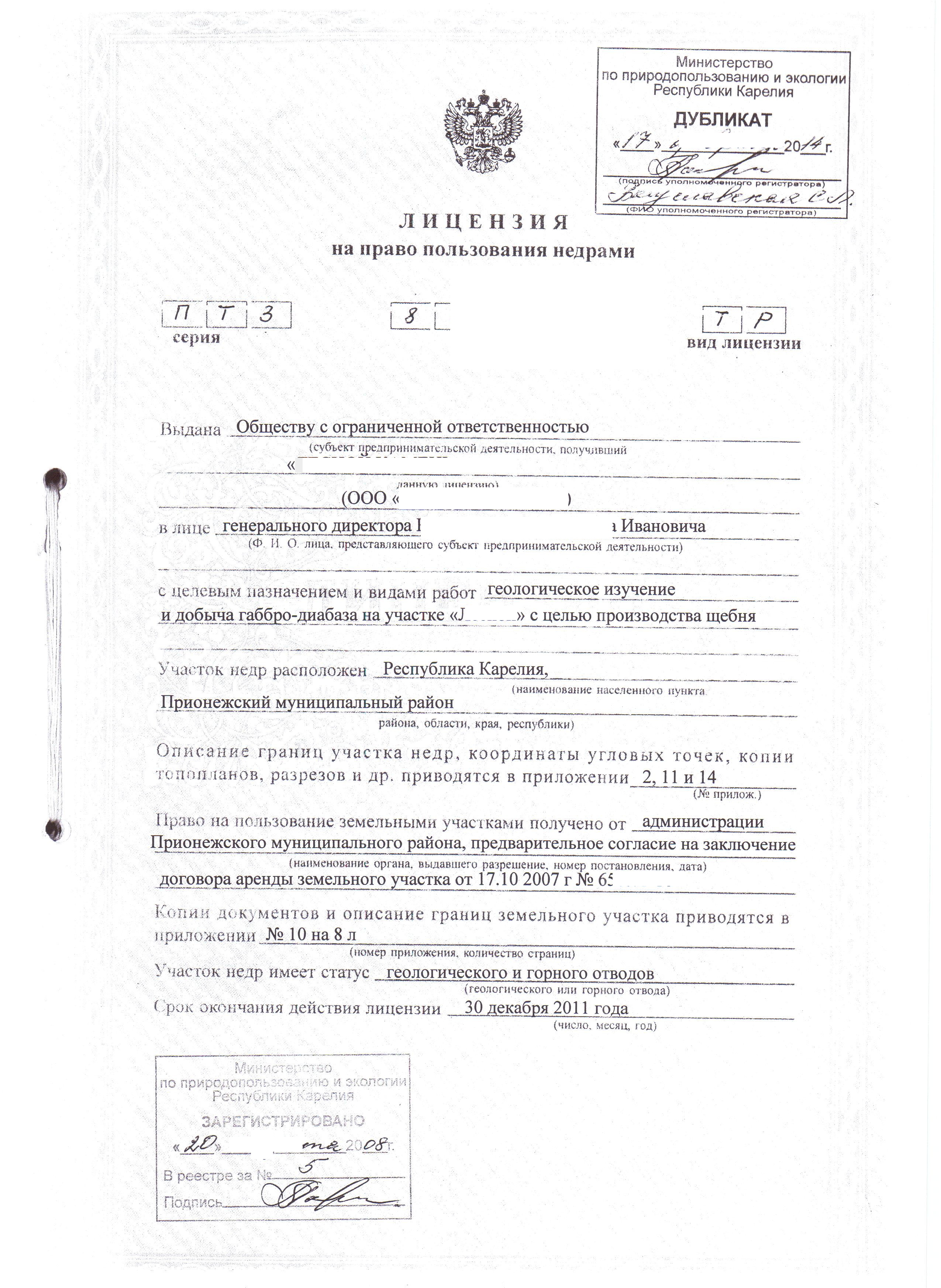 Лицензия на право пользования недрами с целевым назначением видов работ” «геологическое изучение и добыча габбро-диабазов с целью производства щебня».