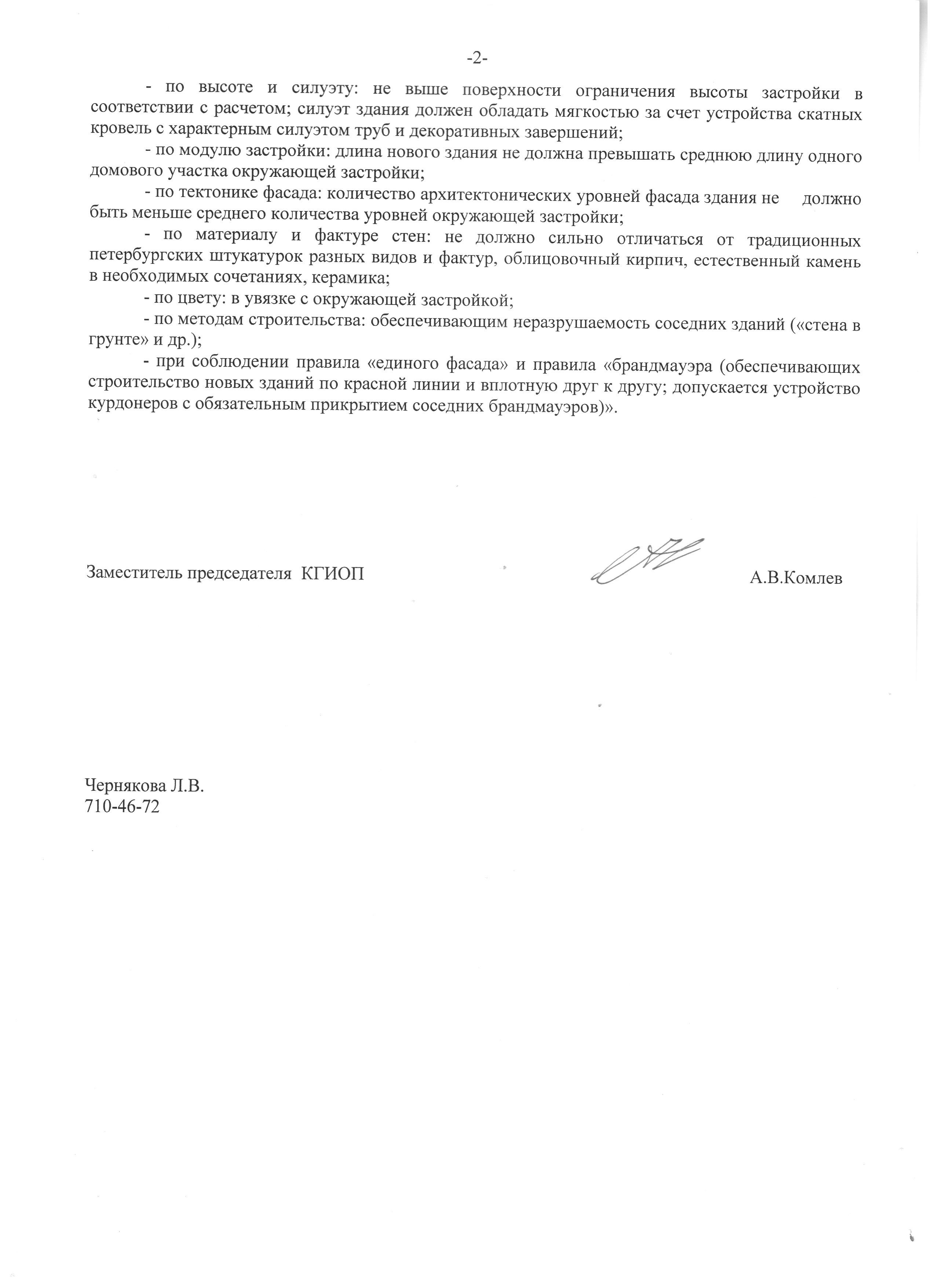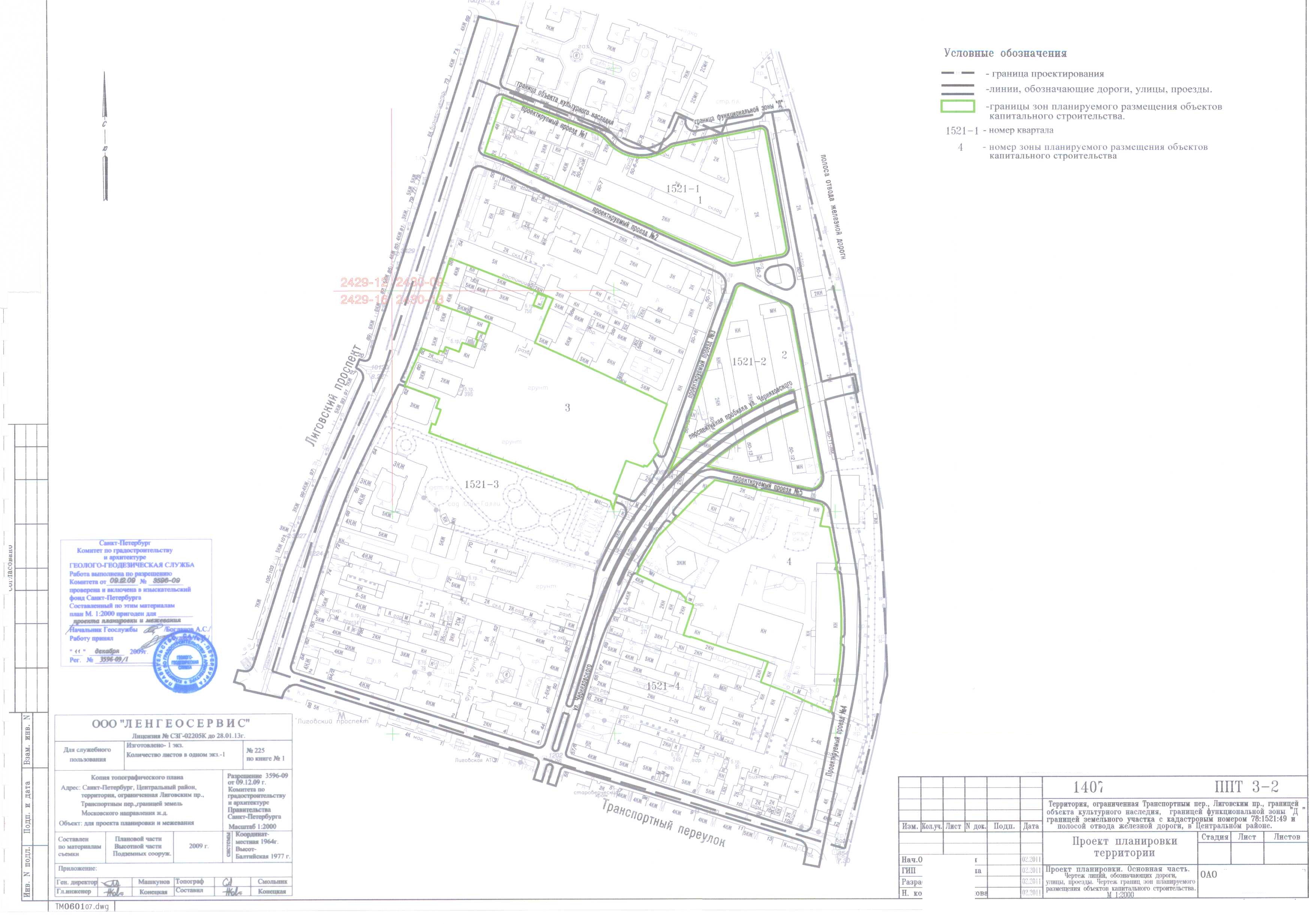 - Разработан проект планировки территории (Постановление Правительства Санкт-Петербурга от 13.9.2011 г.), не предусматривающий изъятие здания под городские проекты. Согласован с КГИОП в части генерального плана, габаритов предельной высоты здания на основании историко-культурной экспертизы земельного участка, согласованной с КГИОП 20.02.2006 г.