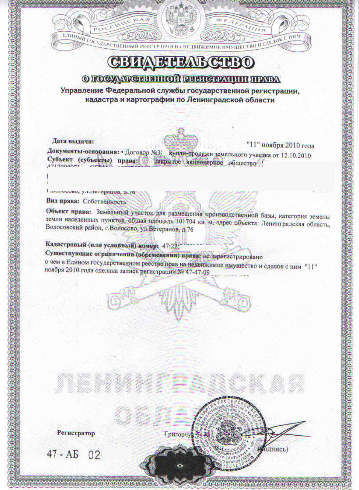 Земельный участок площадью 101704 м2 с двумя железнодорожными тупиками, складскими зданиями и сооружениями в Волосово.