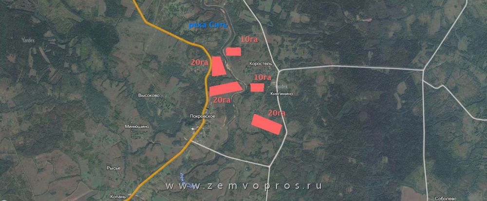 Земельные участки от 10 га общей площадью 80 га для создания коттеджных посёлков и дачных поместий или баз отдыха на берегу реки Сить вблизи сёл Покровское, Коростель, Княгинино, Высокое.