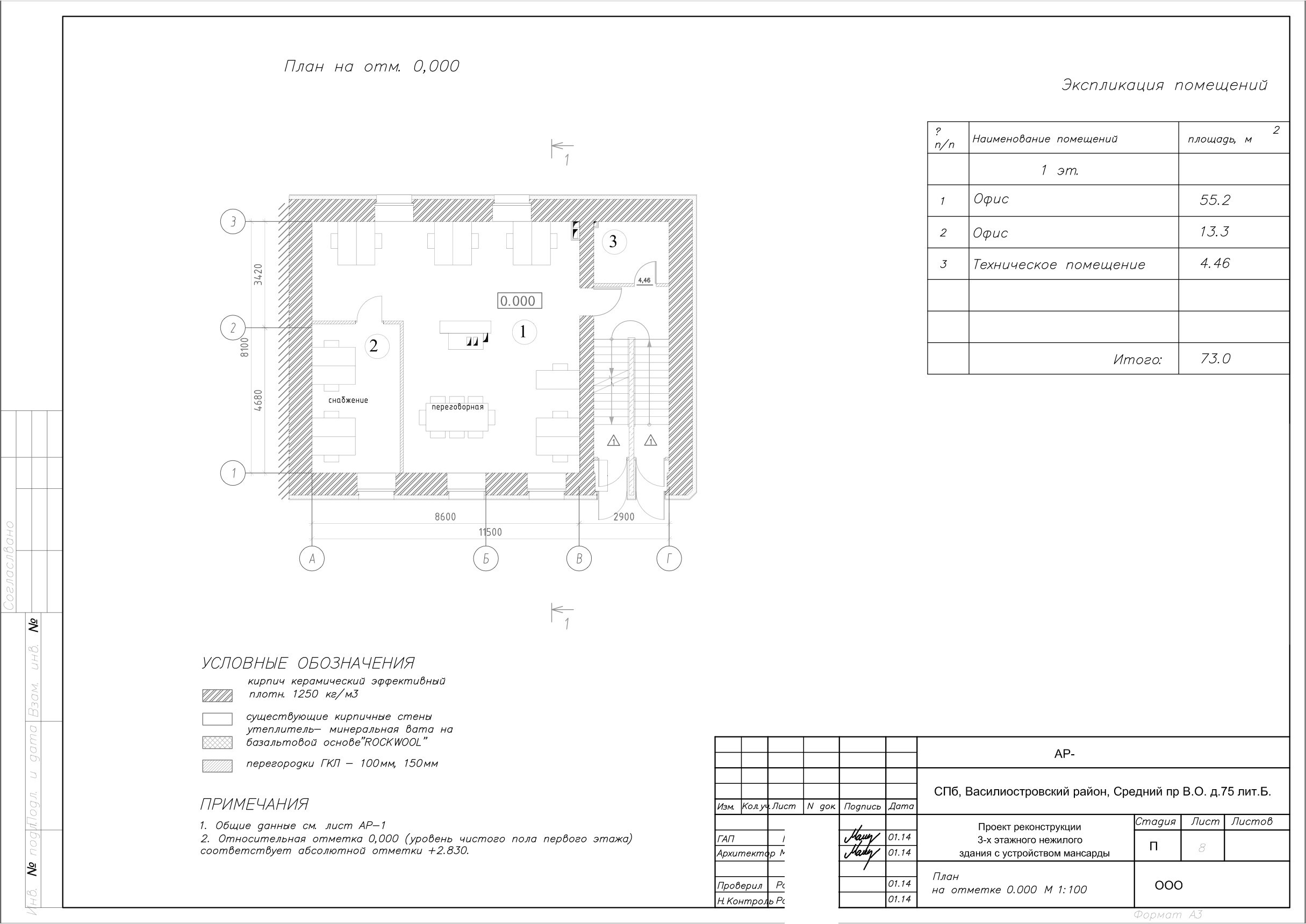 Относительная отметка 0.000 (уровень чистого пола 1-го этажа) соответствует абсолютной отметке +2.830.