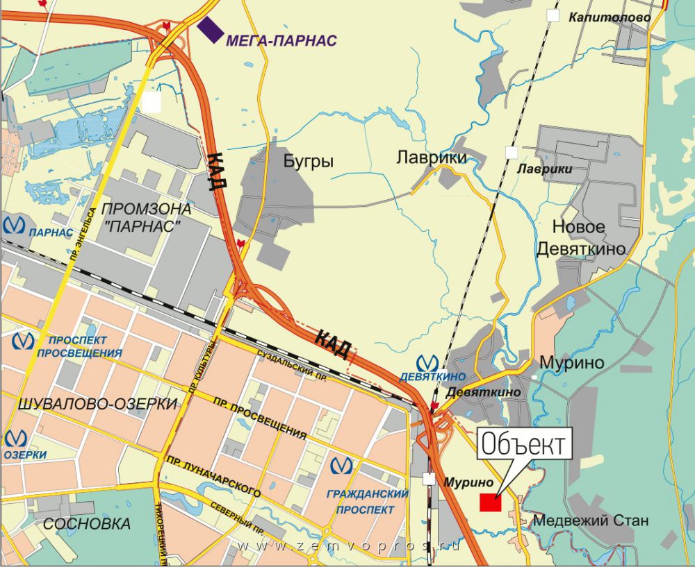 - Участки находятся в непосредственной близости к посёлкам городского типа Мурино и Новое Девяткино, на территории нового жилого микрорайона.