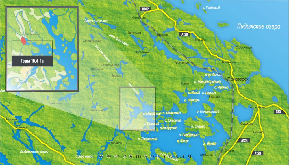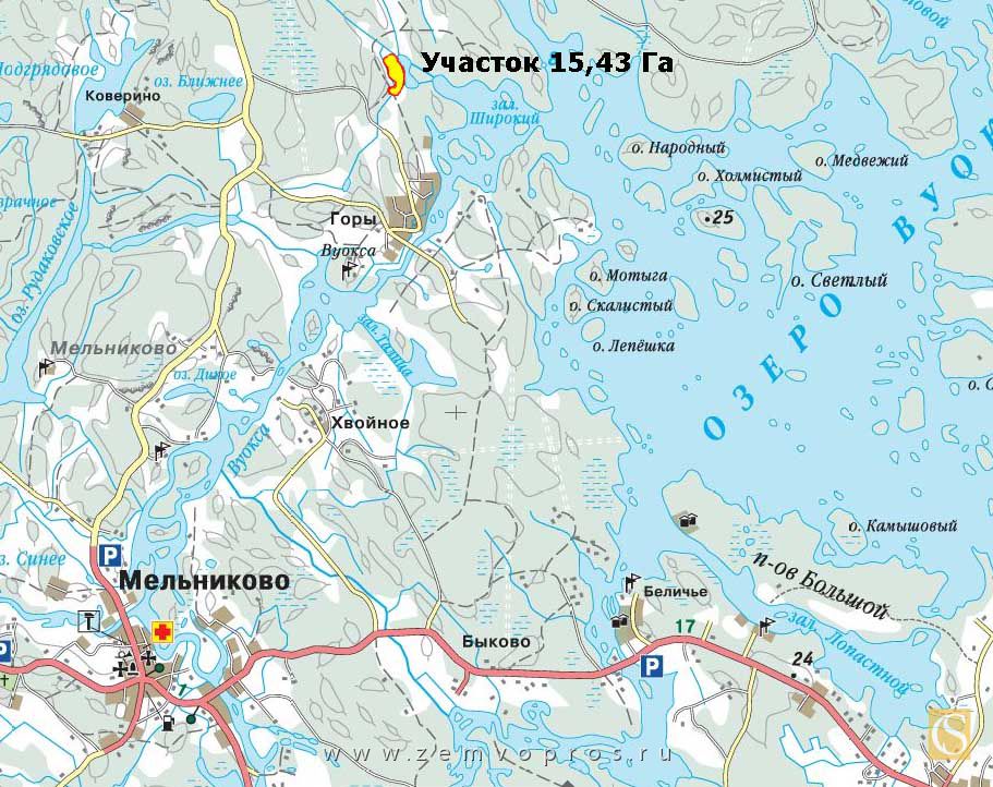 Земельный участок площадью 15.43 га для дачного строительства на заливе Широкий озера Вуокса вблизи посёлка Горы