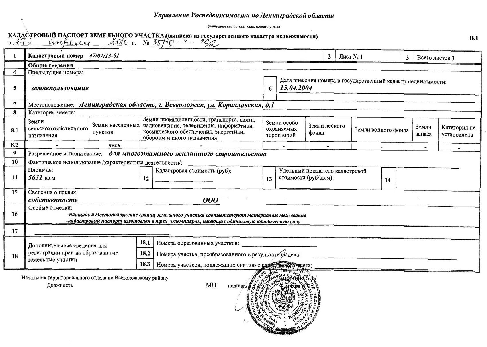 Земельный участок площадью 5631 м2 для строительства многоэтажного жилого дома со встроенными коммерческими помещениями и подземным паркингом в г. Всеволожск.