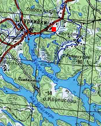 Республика Карелия, Лахденпохский район, в 600 метрах от посёлка Куркиёки, хутор Соскуа.