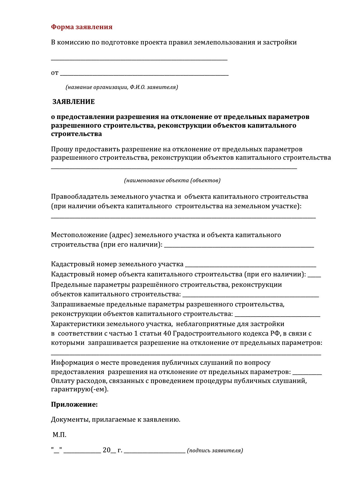 1. В комиссию по ПЗЗ необходимо подать заявление о предоставлении разрешения на отклонение от предельных параметров разрешённого строительства