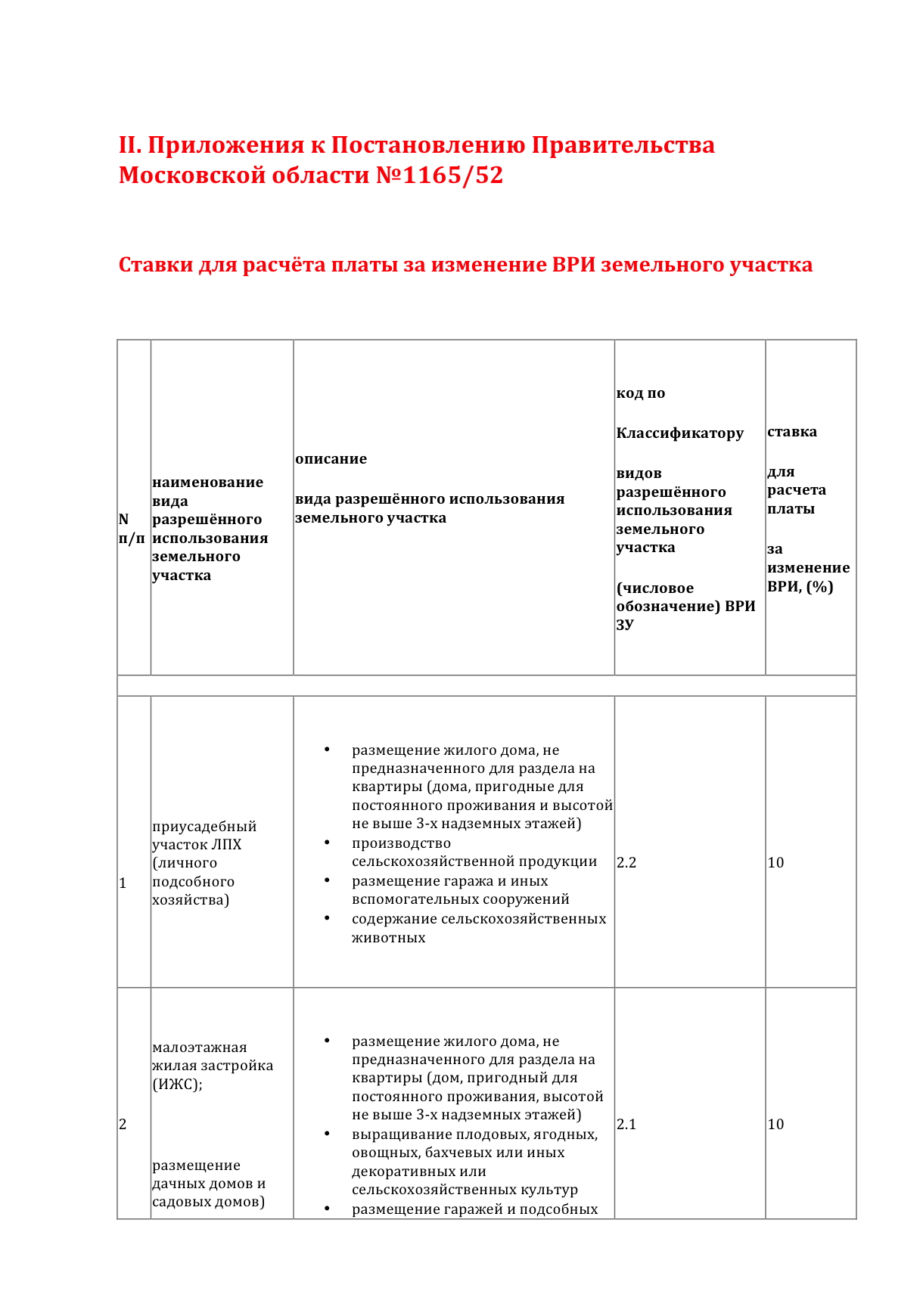 Постановлением Правительства Московской области №1165/52 от 30.12.14, кроме введения платы за изменение ВРИ ЗУ, установлены: