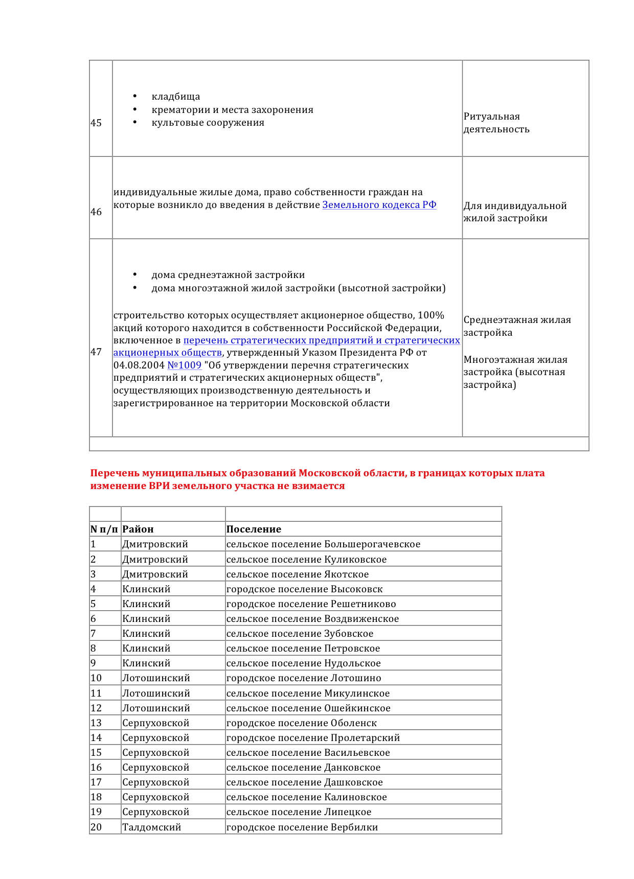 - Перечень муниципальных образований Московской области, в границах которых плата изменение ВРИ земельного участка не взимается