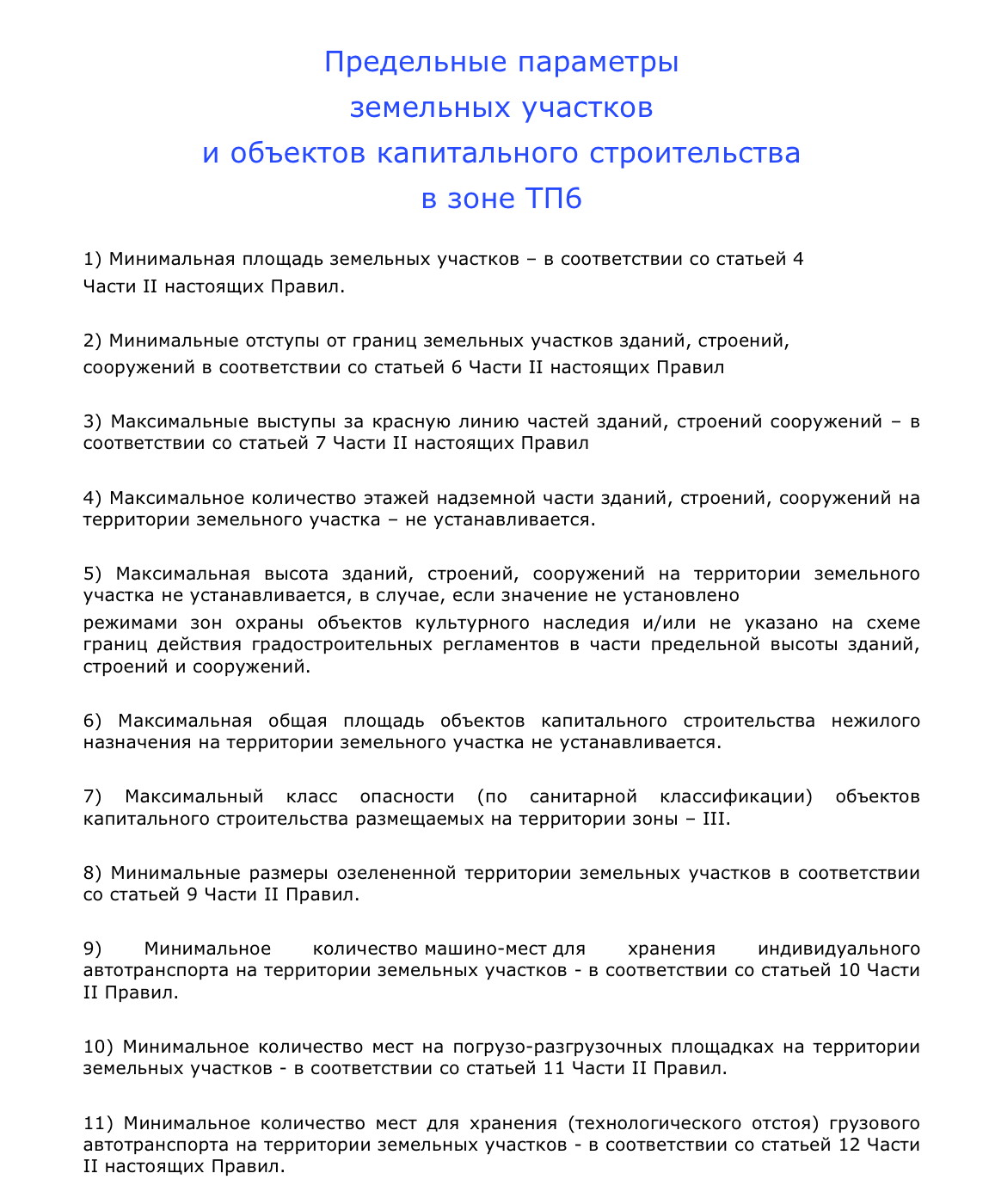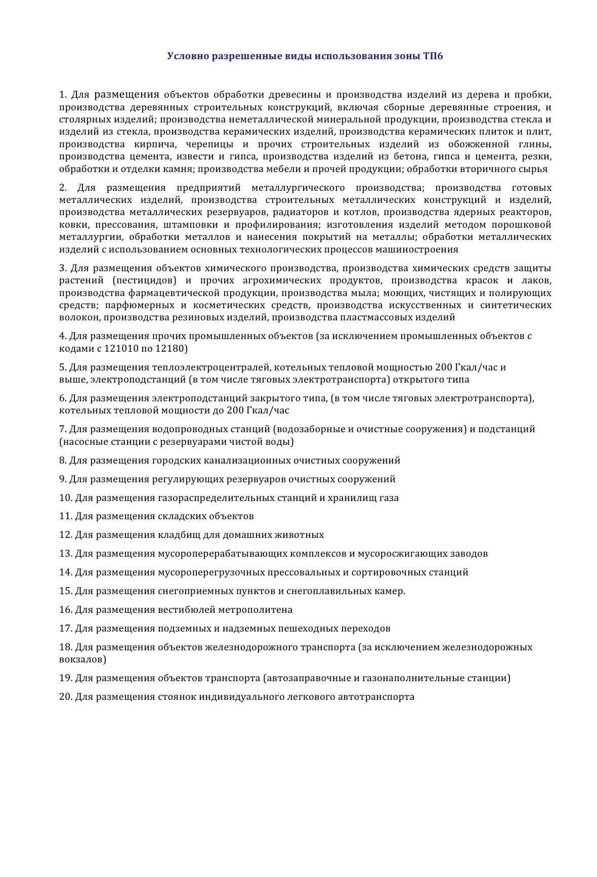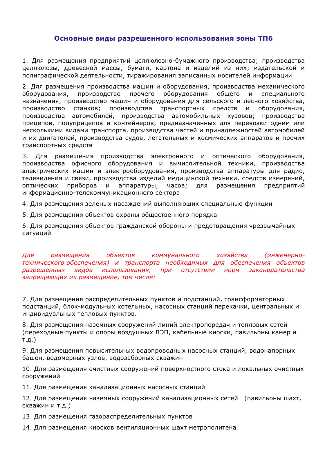 ТП6 – производственная зона объектов целлюлозно-бумажного производства, издательской и полиграфической деятельности, включая объекты производства машин и оборудования, электронного и оптического оборудования, предприятий информационно-телекоммуникационного сектора, с включением объектов инженерной инфраструктуры