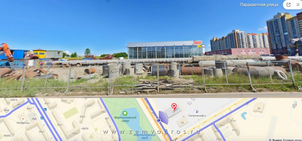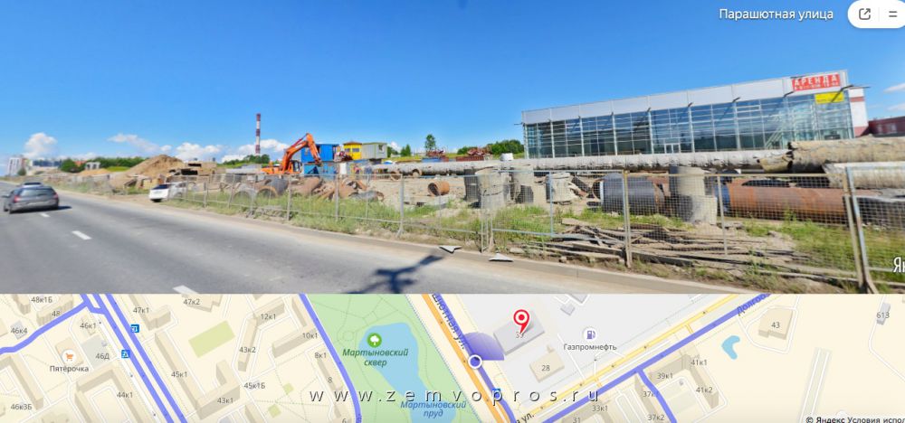 - с запада - проезжей частью Парашютной улицы, на расстоянии 80 м от границы участка - Мартыновский сквер.