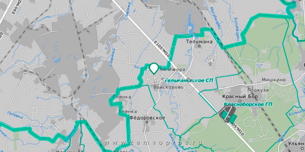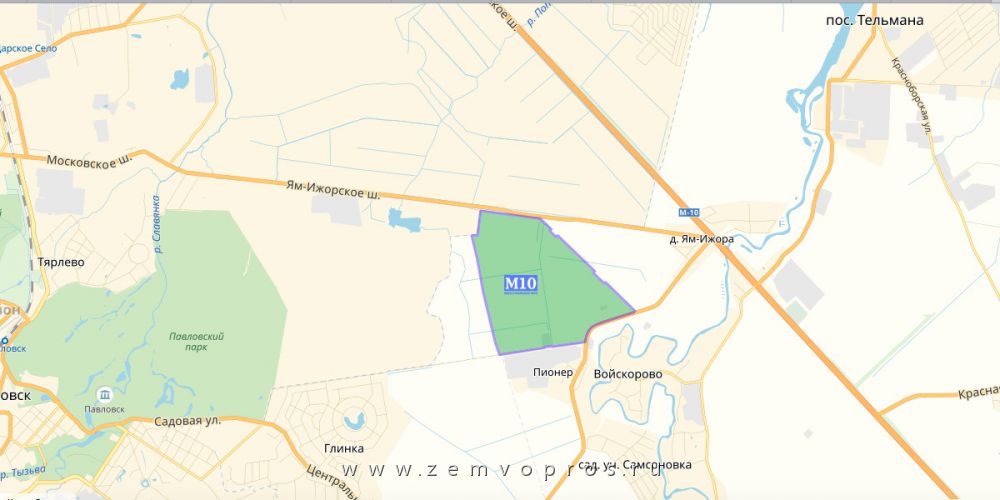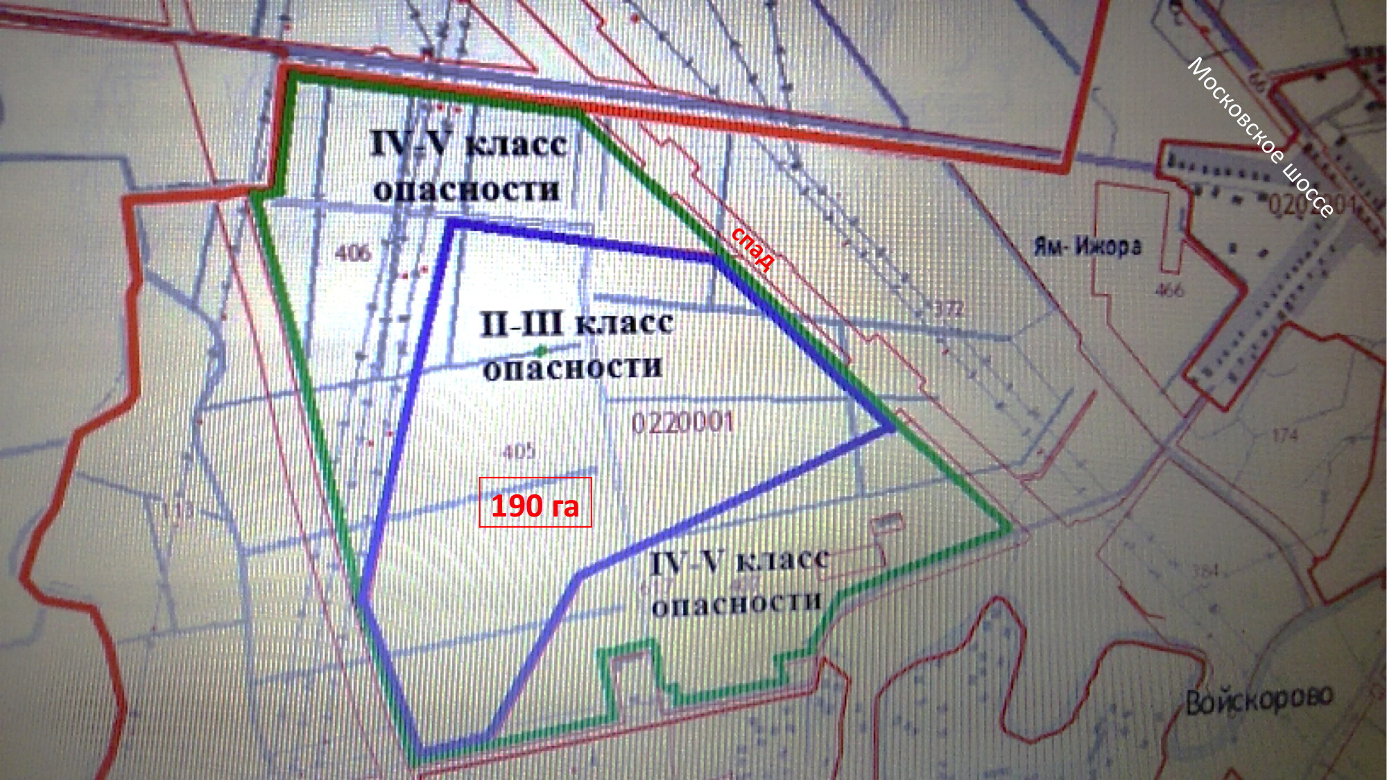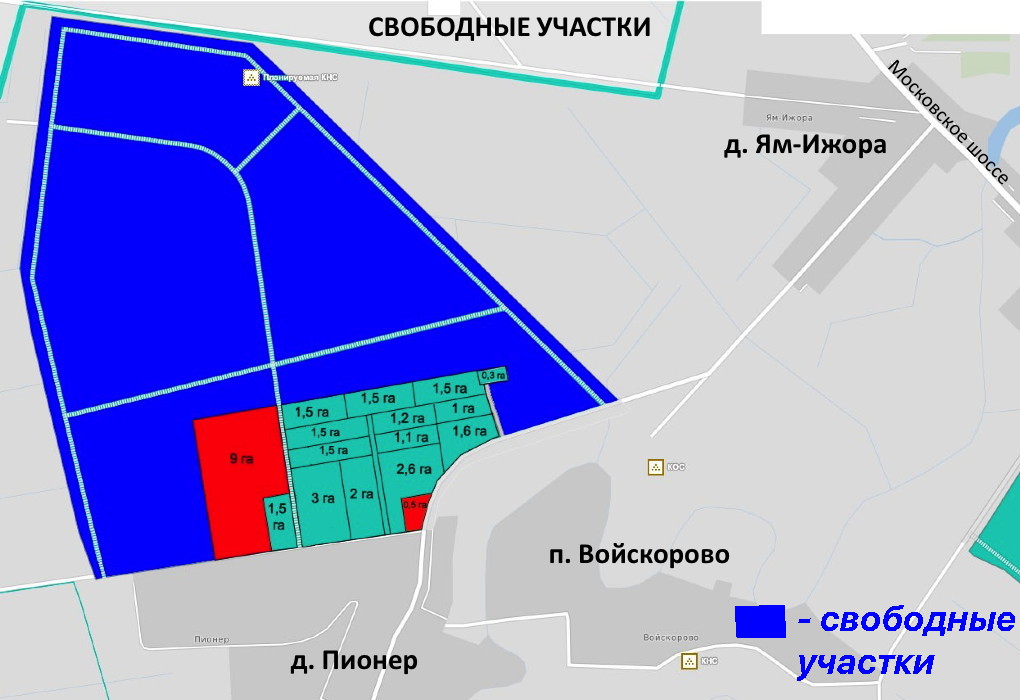 Земельные участки промназначения общей площадью 180 га под размещение производственных предприятий II класса санитарной опасности на границе с Санкт-Петербургом у деревни Пионер.