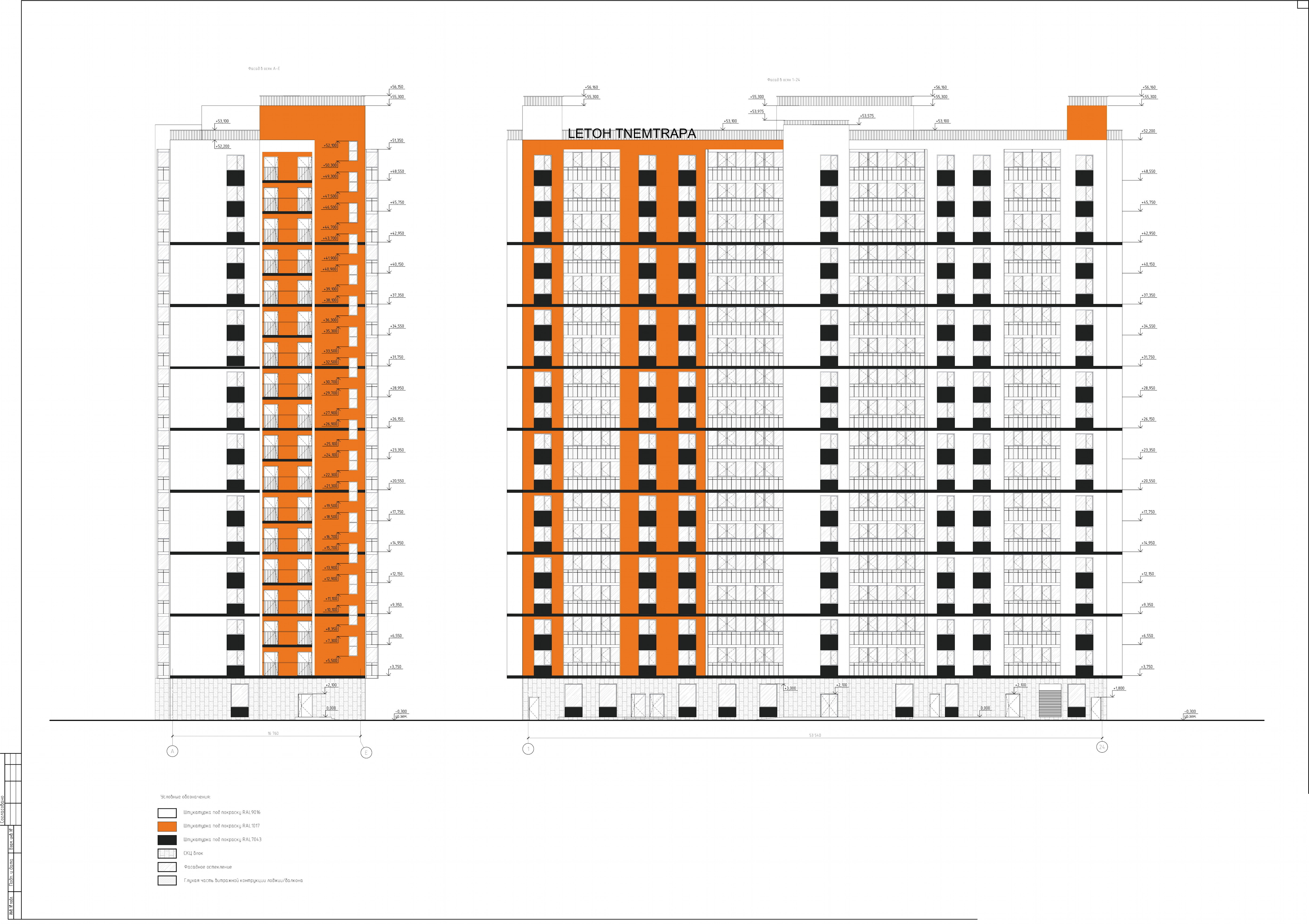 - цветовое решение фасадов решено в спокойных тонах с оранжевыми вставками: