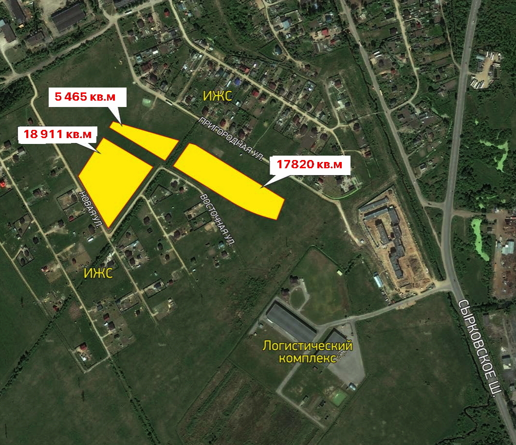 Три земельных участка общей площадью 4.22 га под строительство малоэтажного жилого комплекса в деревне Сырково вблизи Великого Новгорода.