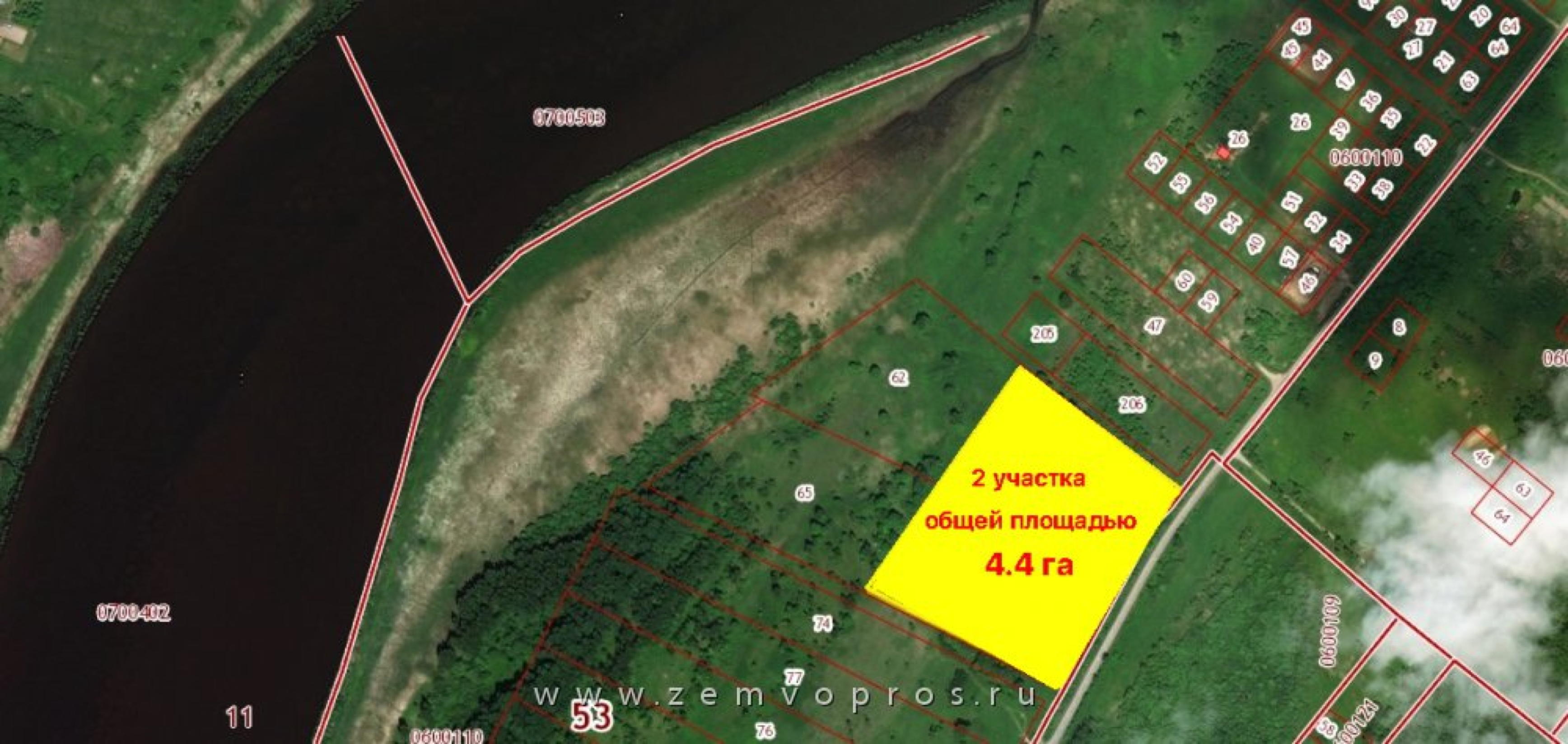 Два смежных земельных участка общей площадью 4.4 га под ЛПХ в черте населённого пункта у реки Волхов в деревне Шевелёво.