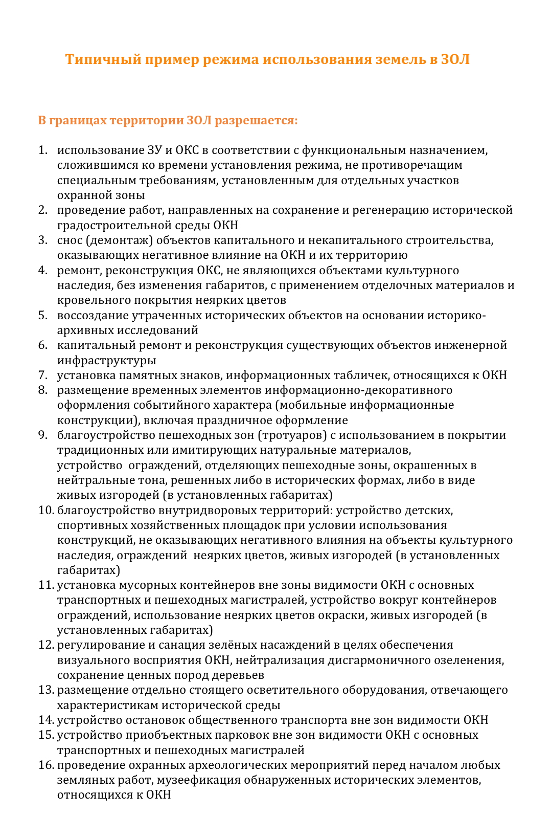 Режим использования земель в ЗОЛ обеспечивает сохранение и восстановление природного ландшафта, включающего также долины рек, водоёмы, леса и открытые пространства, связанные композиционно с объектами культурного наследия.