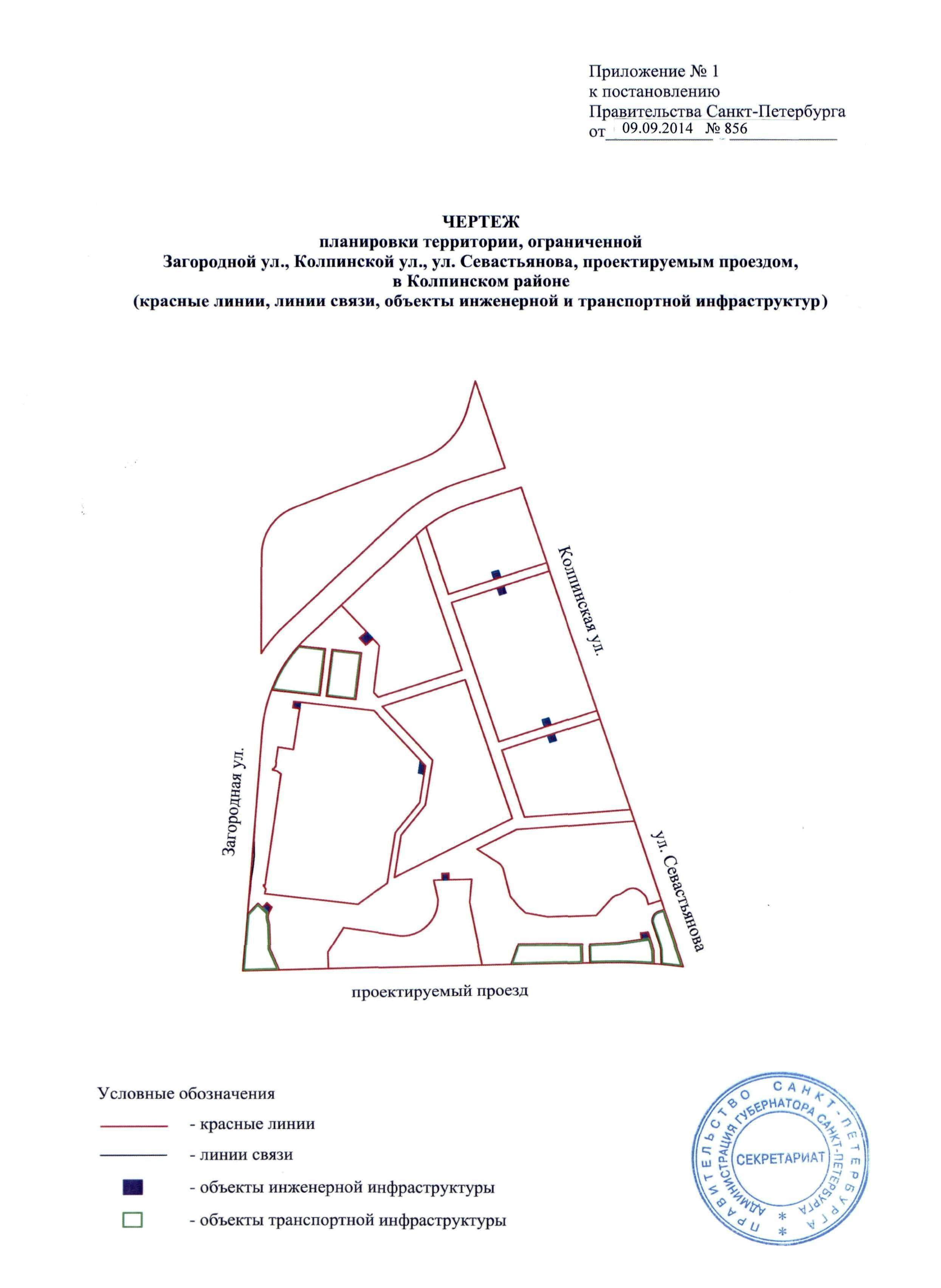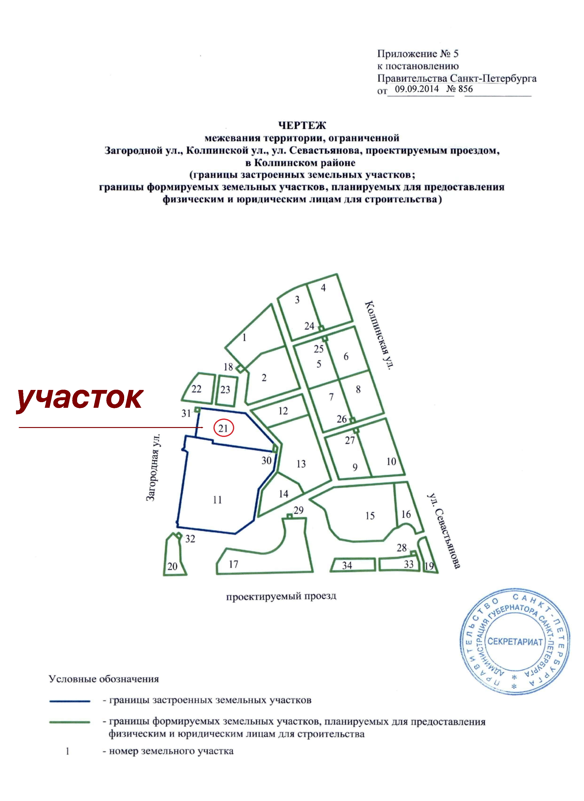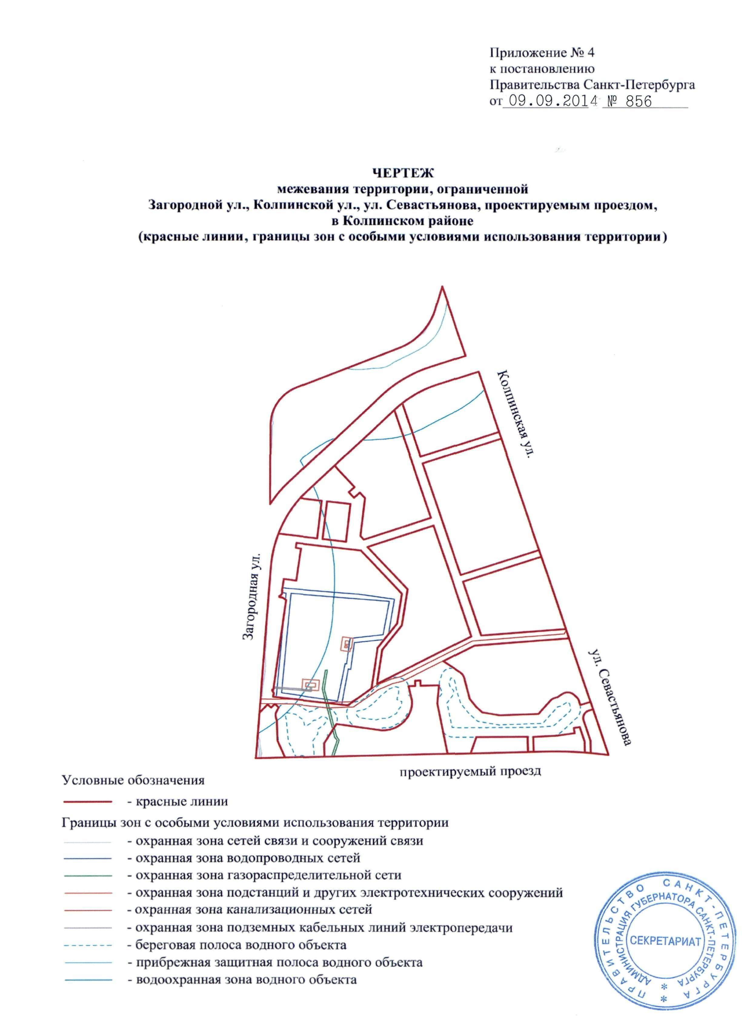 Для территории, ограниченной улицами Загородная, Колпинская, Севастьянова и проектируемым проездом, в которую входит предлагаемый земельный участок, утверждён проект планировки с проектом межевания (Постановление Правительства Санкт-Петербурга № 856 от 09.09.2014).