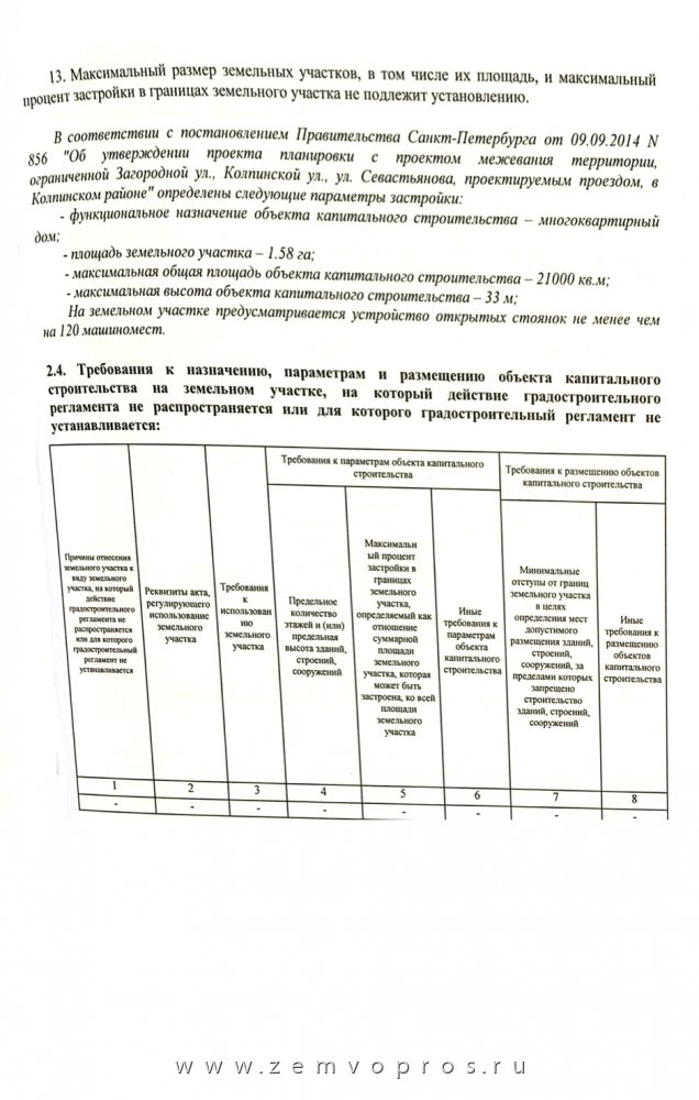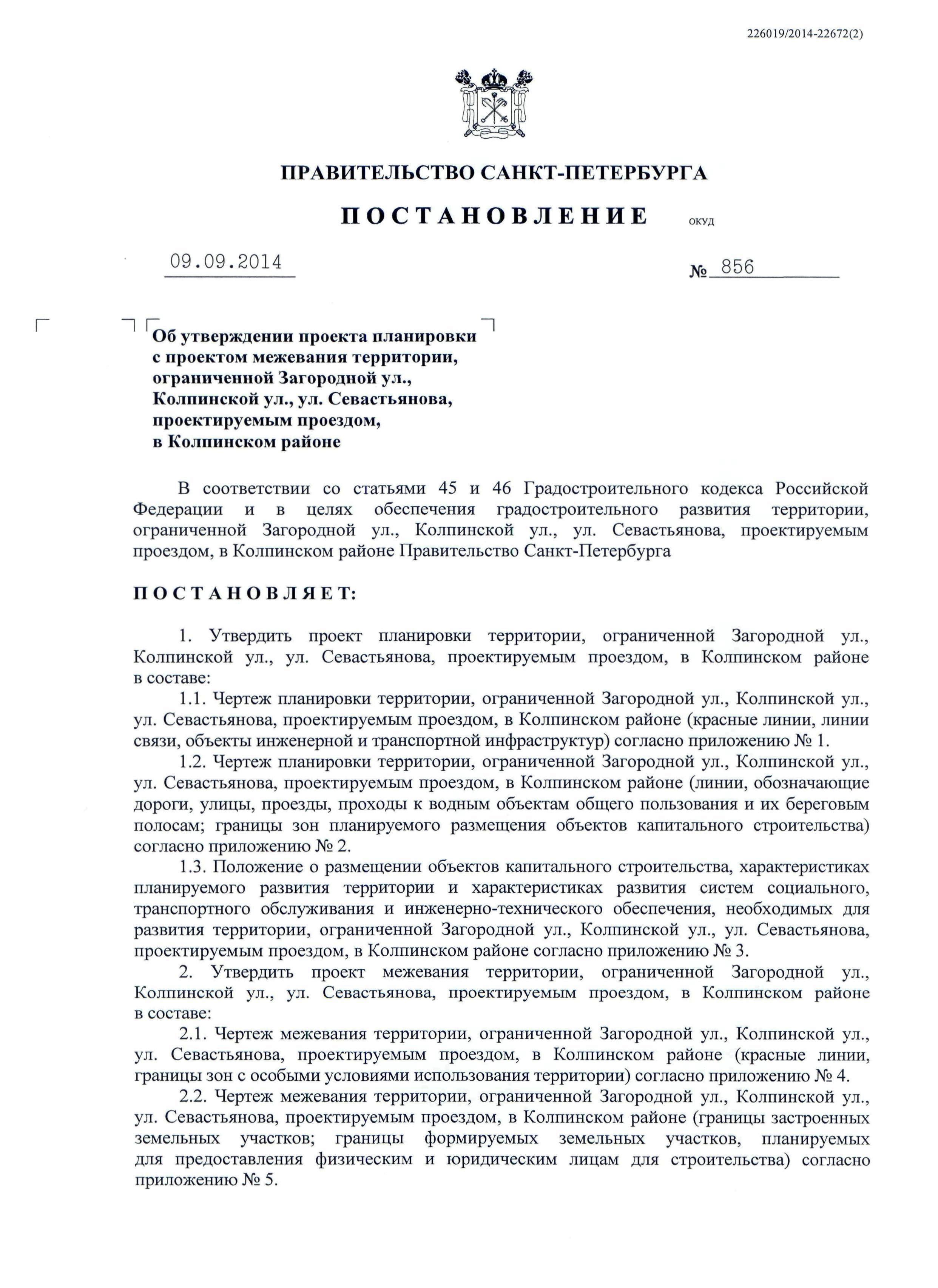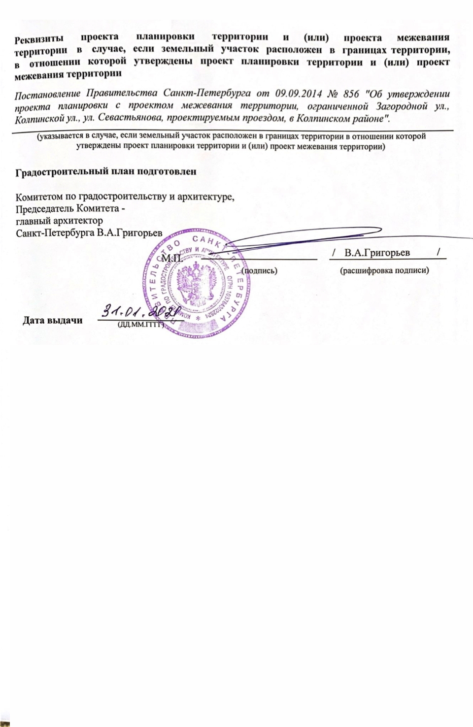 Для территории, ограниченной улицами Загородная, Колпинская, Севастьянова и проектируемым проездом, в которую входит предлагаемый земельный участок, утверждён проект планировки с проектом межевания (Постановление Правительства Санкт-Петербурга № 856 от 09.09.2014).