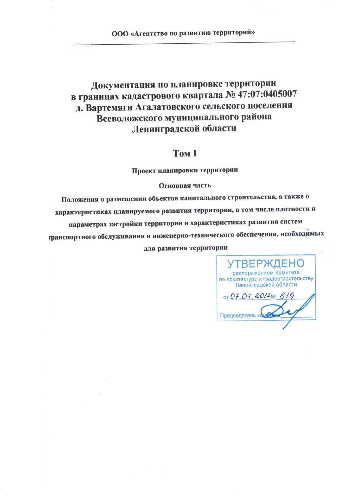 - Утверждён ППТ в границах кадастрового квартала 47:07:0405007 (Распоряжение комитета по архитектуре и градостроительству Ленинградской области (№ 819 от 7 июля 2017 г.)