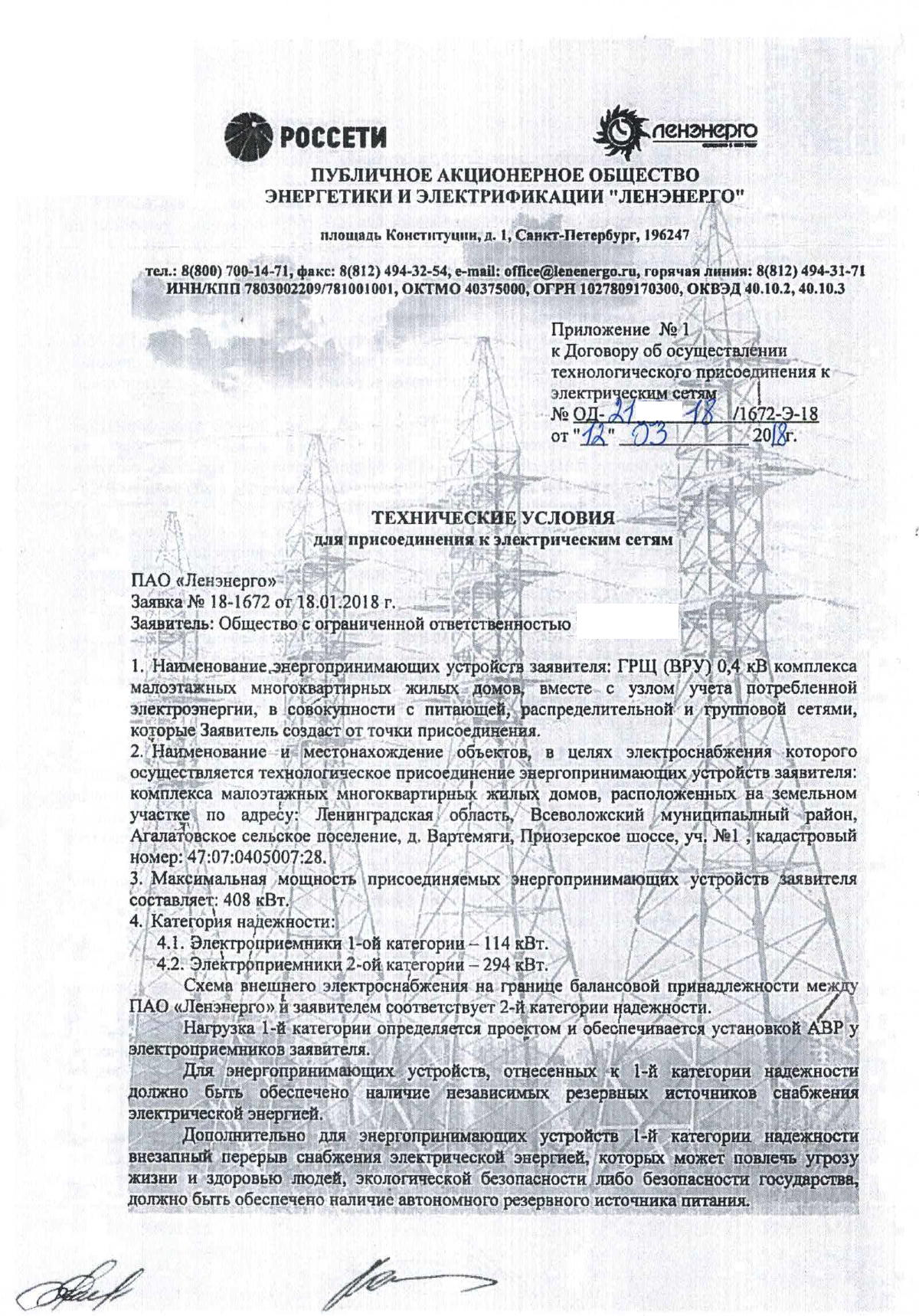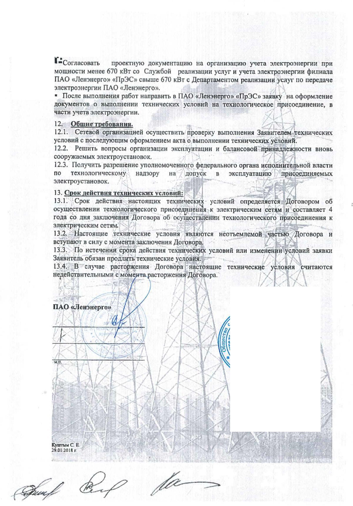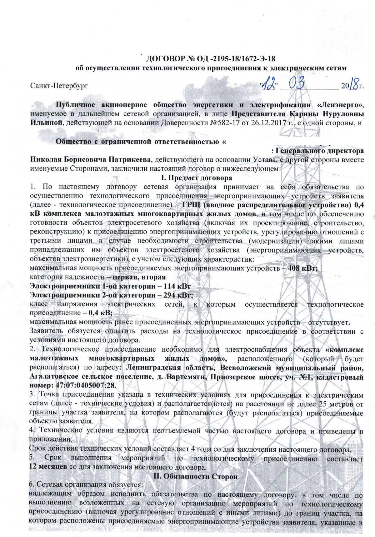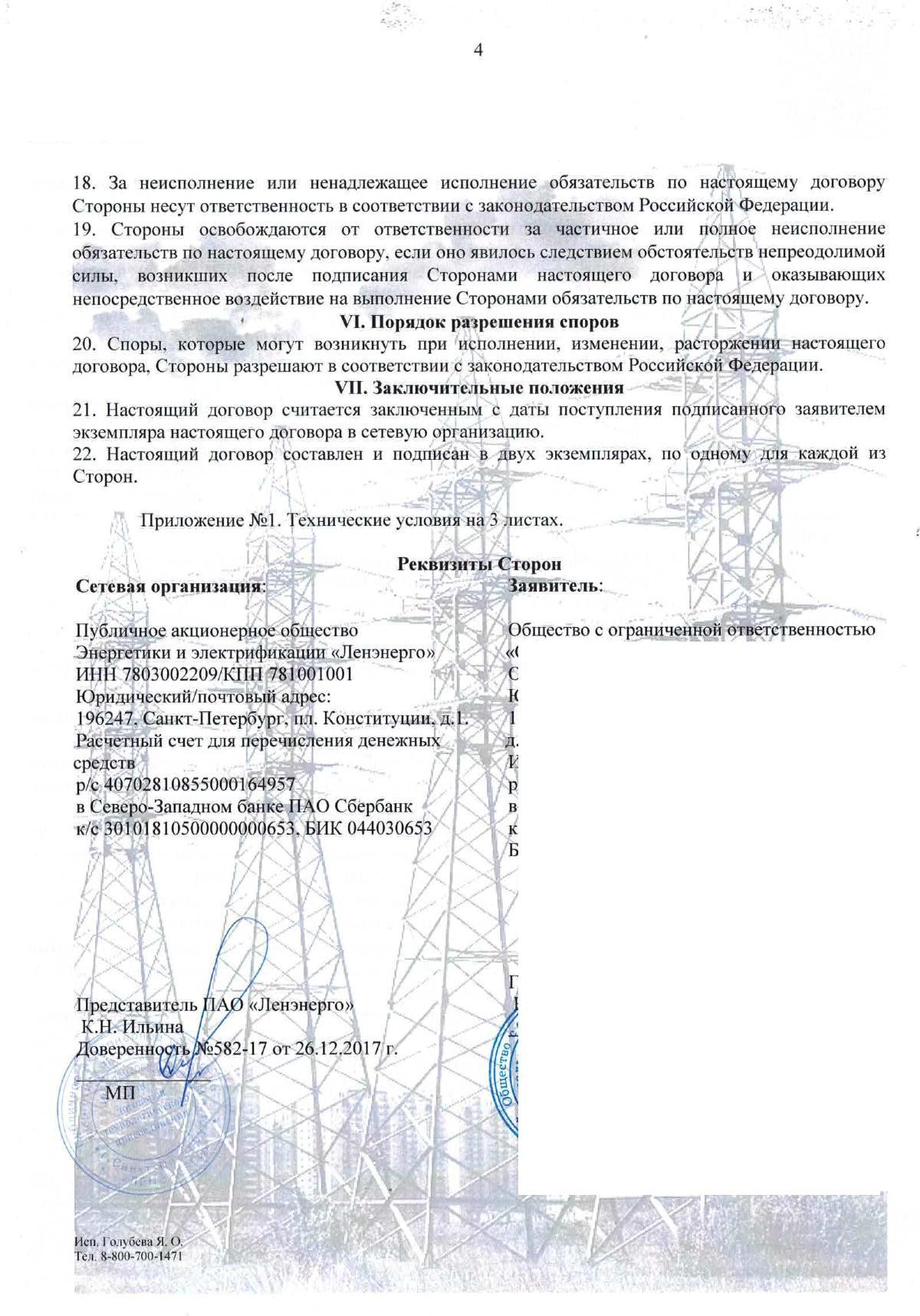 - заключённый договор с ПАО «Ленэнерго» на присоединение к сетям электроснабжения