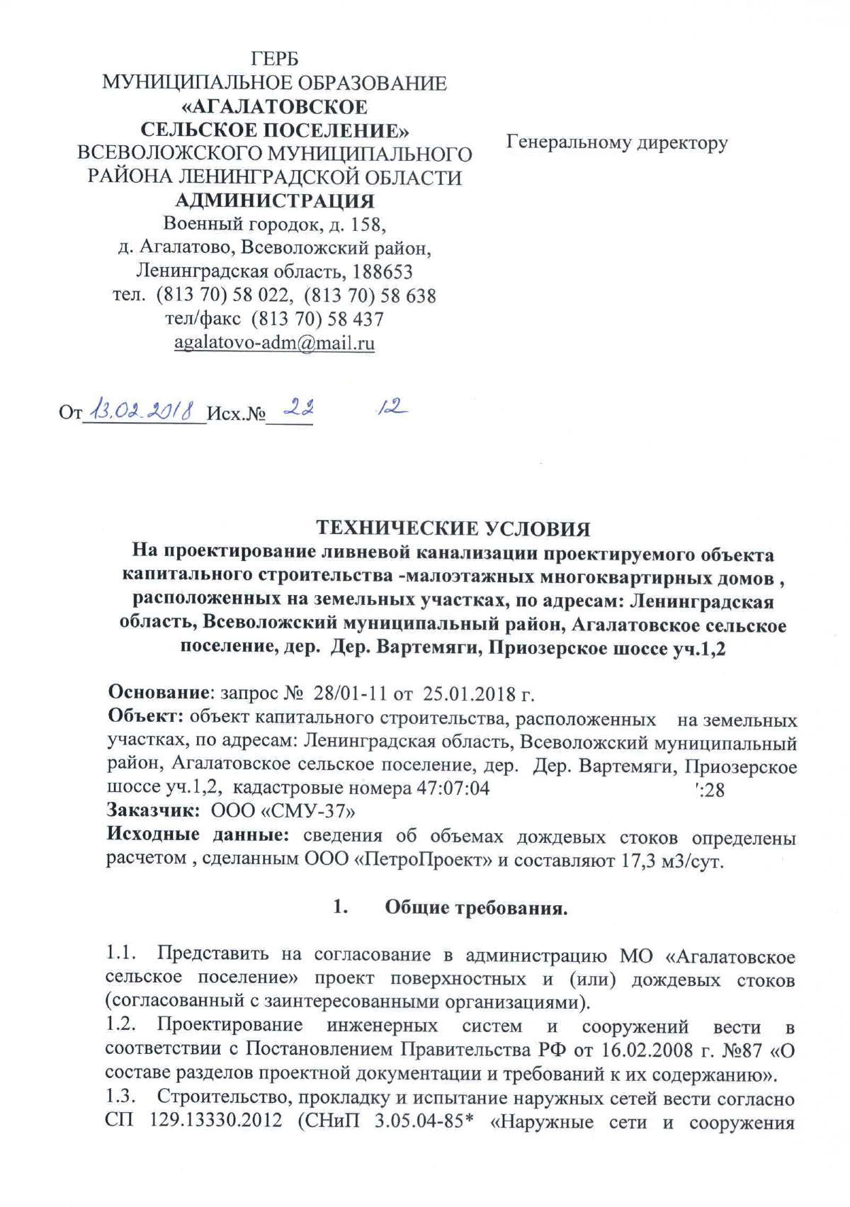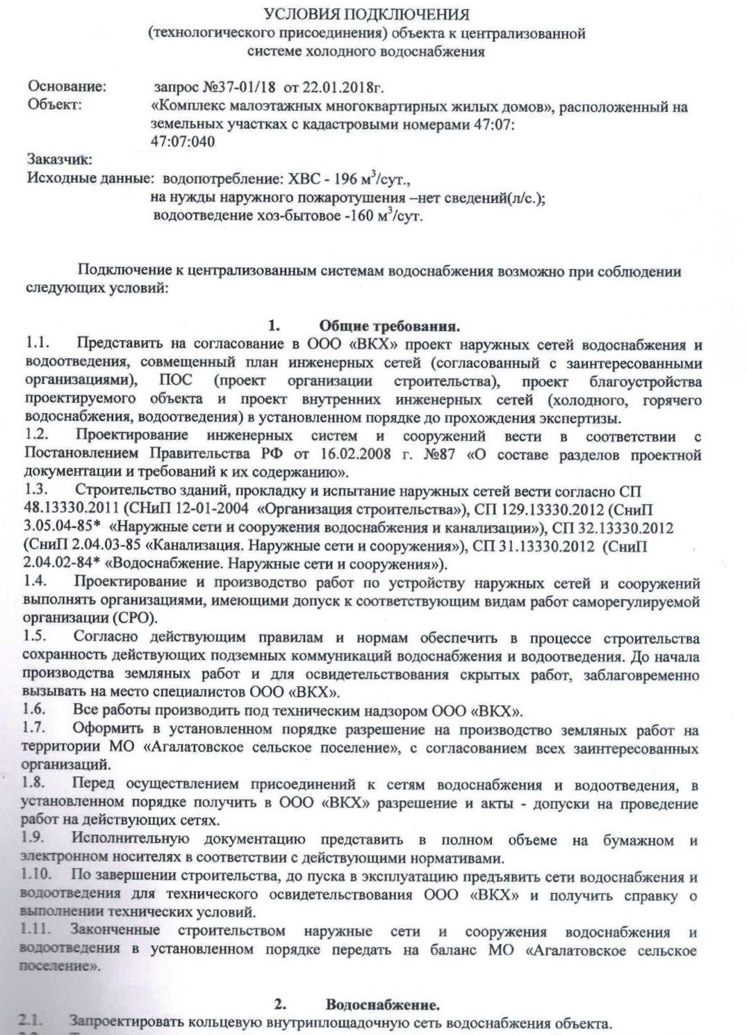 - получены ТУ на теплоснабжение с МП Агалатово-Сервис