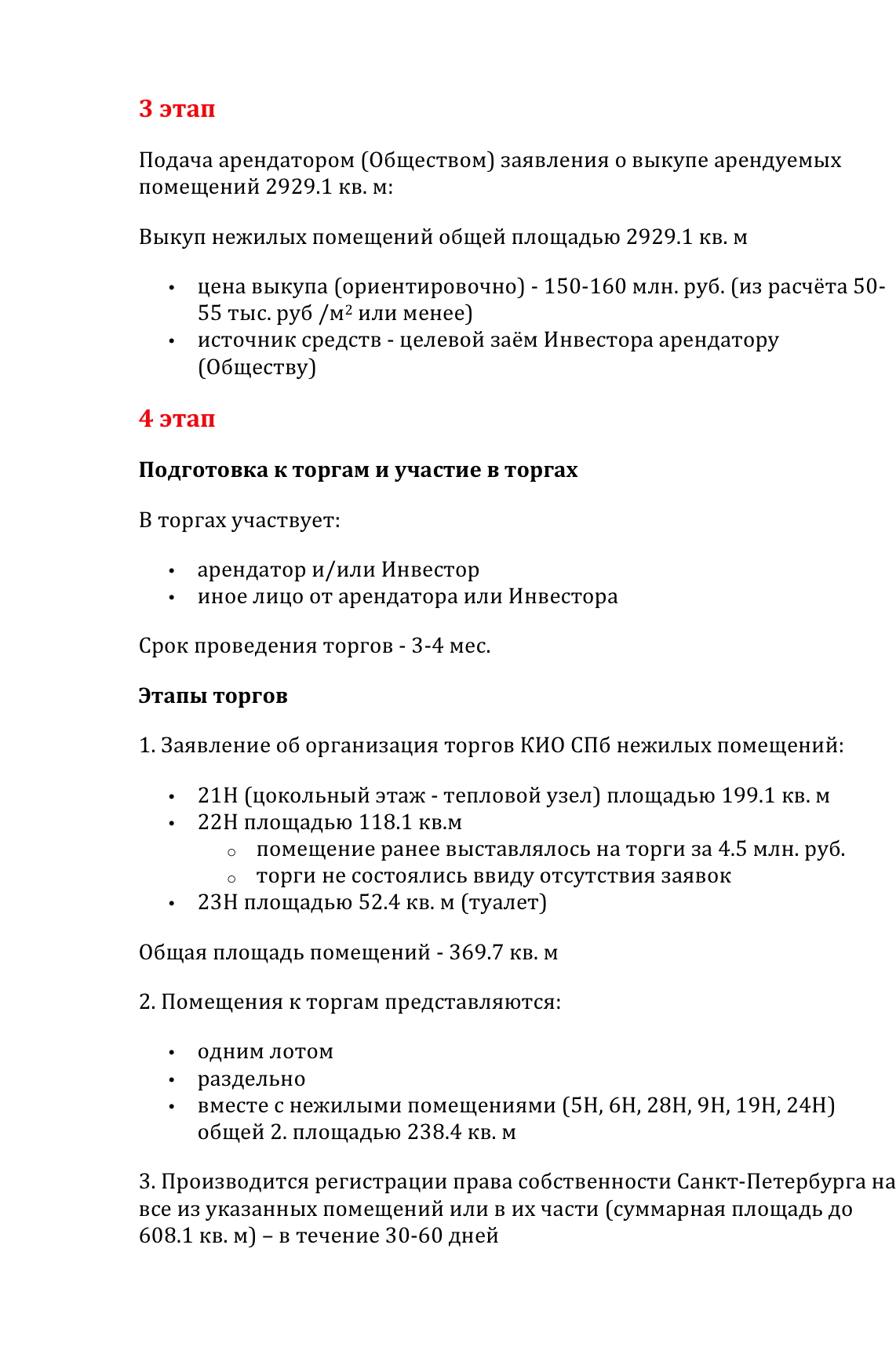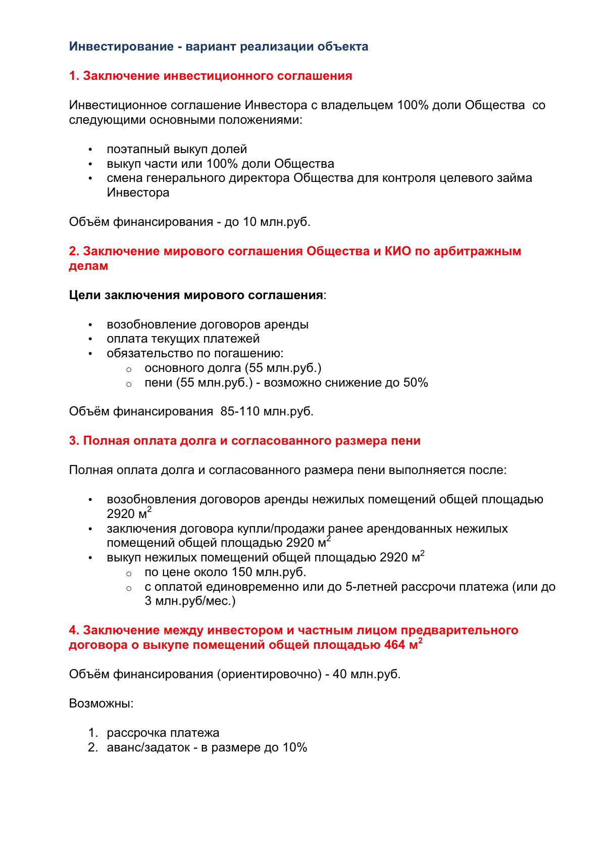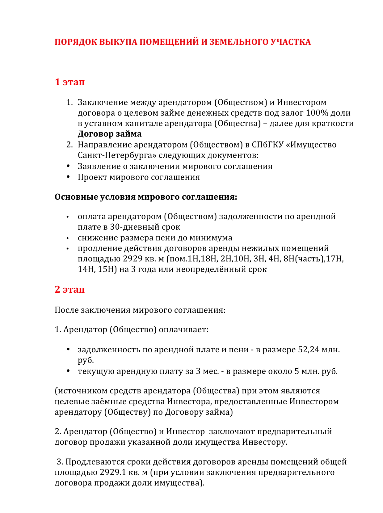 - получение целевого займа от Инвестора для погашения задолженности по арендной плате и пеням