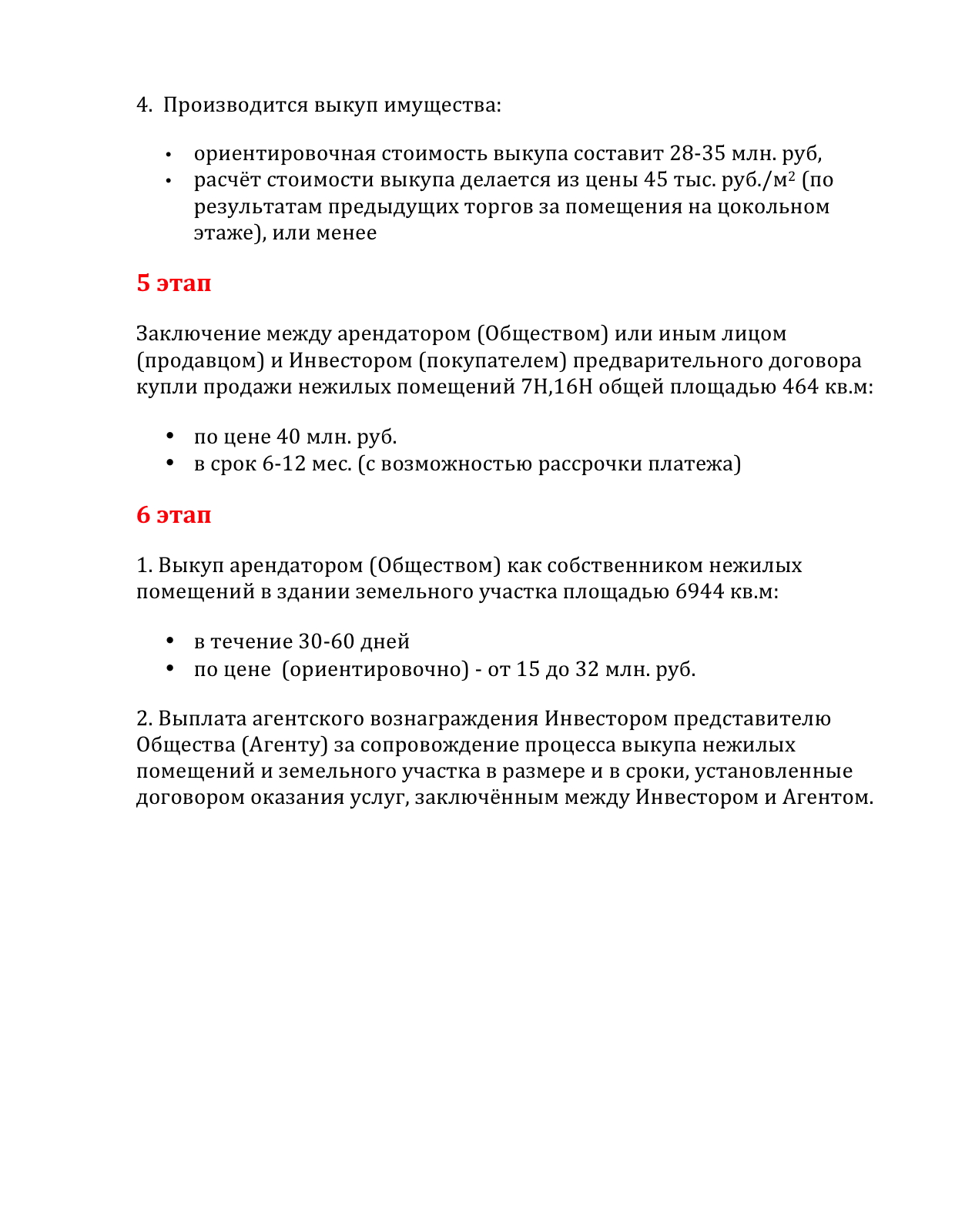 - выкуп Инвестором (или арендатором) земельного участка площадью 6944 м2 после регистрации права собственности на выкупленные помещения