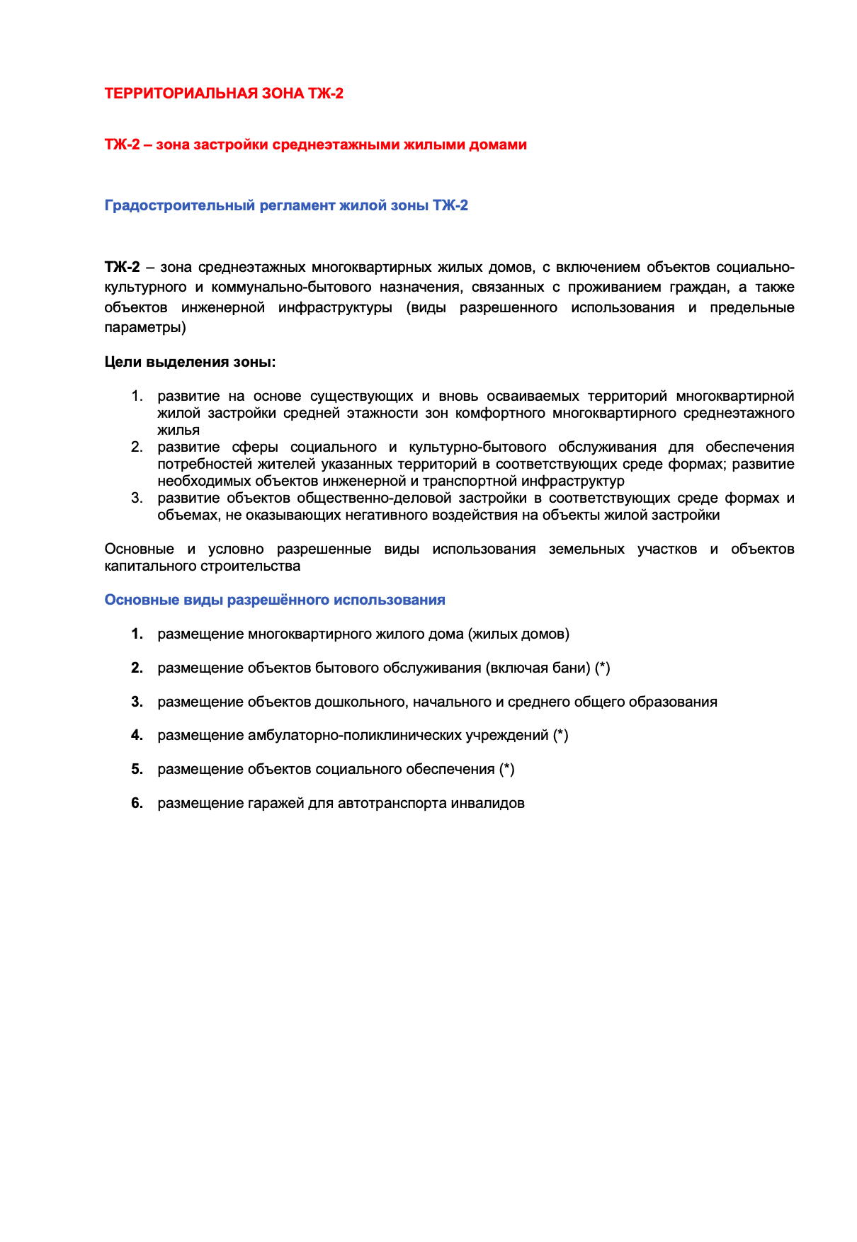 ТЖ-2 – зона среднеэтажных многоквартирных жилых домов, с включением объектов социально-культурного и коммунально-бытового назначения, связанных с проживанием граждан, а также объектов инженерной инфраструктуры