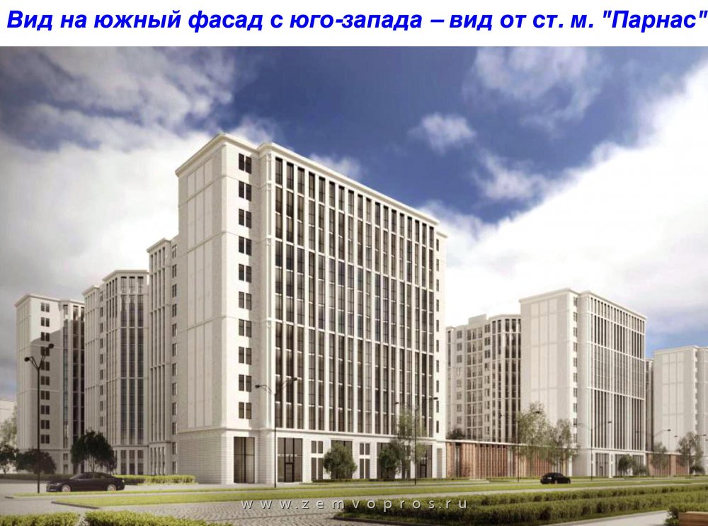 - в 100 м, напротив участка, – станция метро «Парнас»