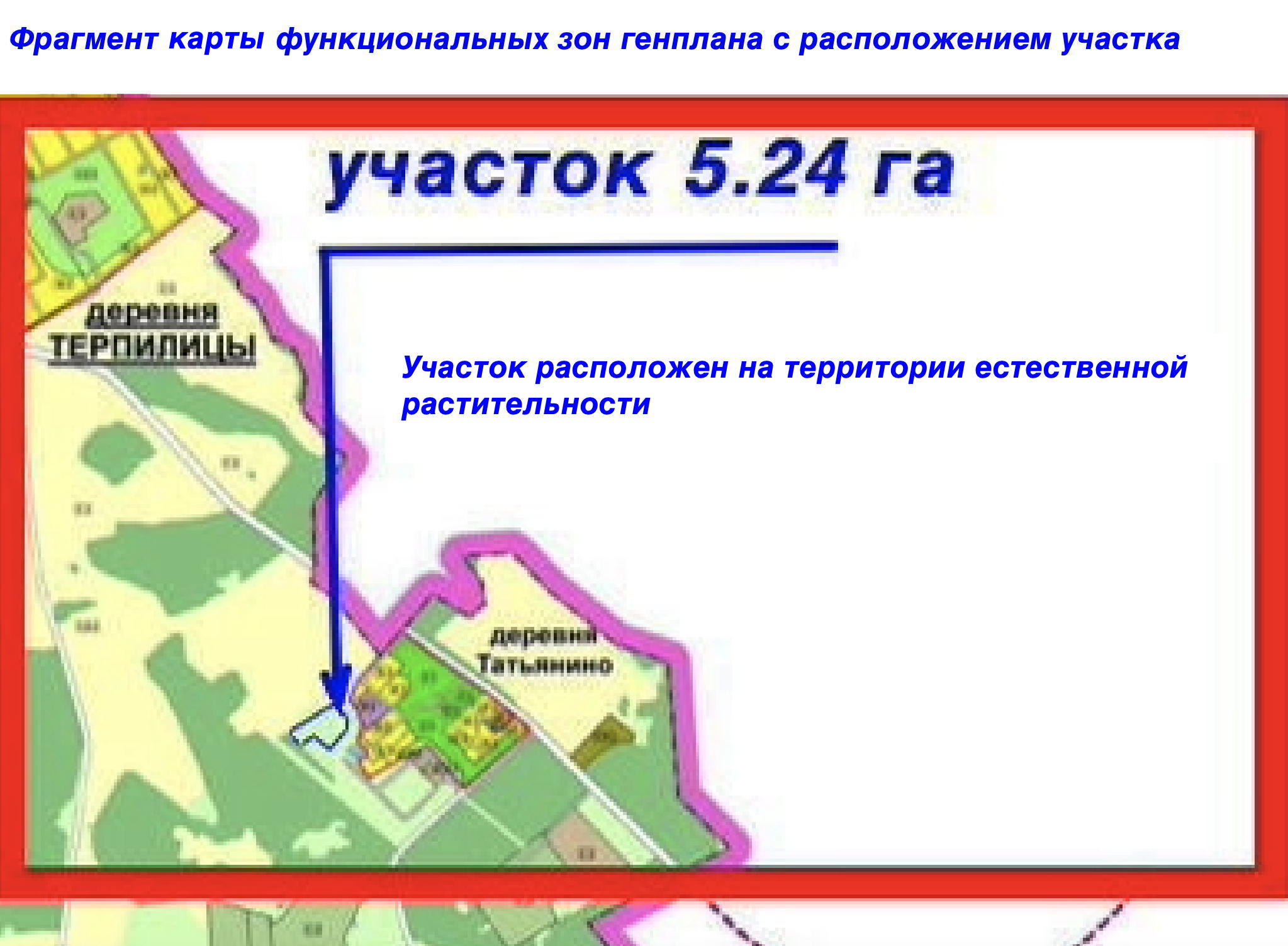 В соотвествии с картой функциональных зон генерального плана земельный участок расположен на территории естественной растительности в районе деревни Татьянино.