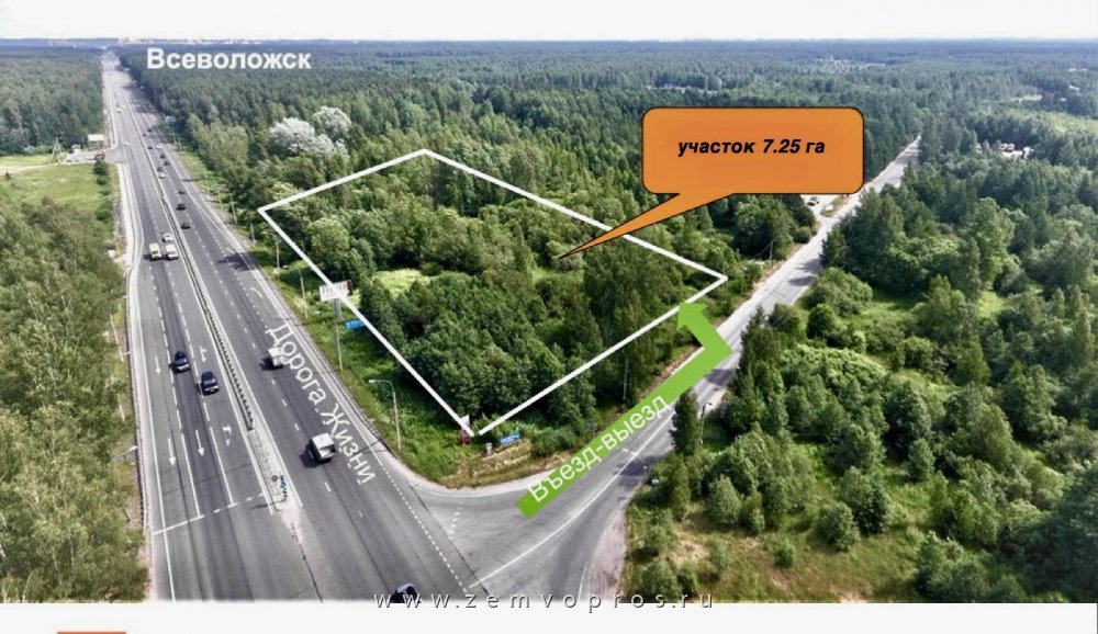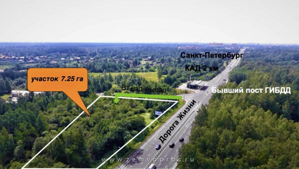 Земельный участок площадью 7.25 га под размещение объектов общественно-деловой застройки на 1 линии Дороги Жизни (Рябовское шоссе) у посёлка Ковалёво.