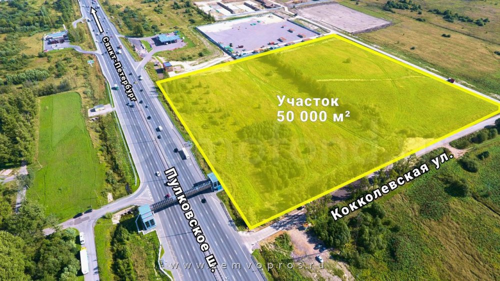 Земельный участок площадью 5 га под общественно-деловую и жилую застройку на 1 линии Пулковского шоссе по направлению движения в Санкт-Петербург.