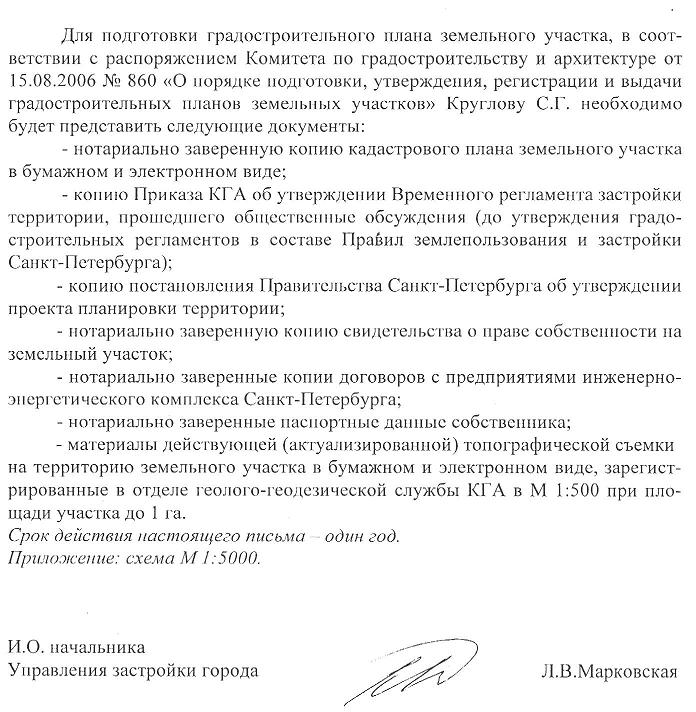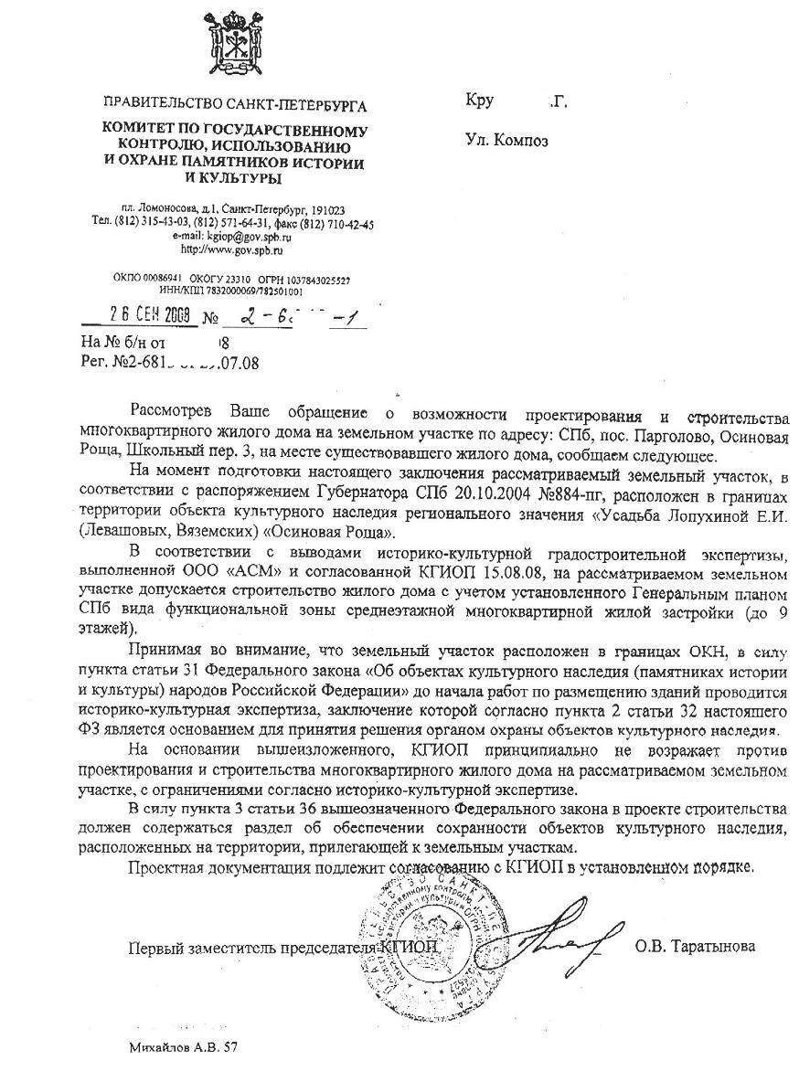 - письмо КГИОП о возможности возведения на земельном участке многоквартирного жилого дома