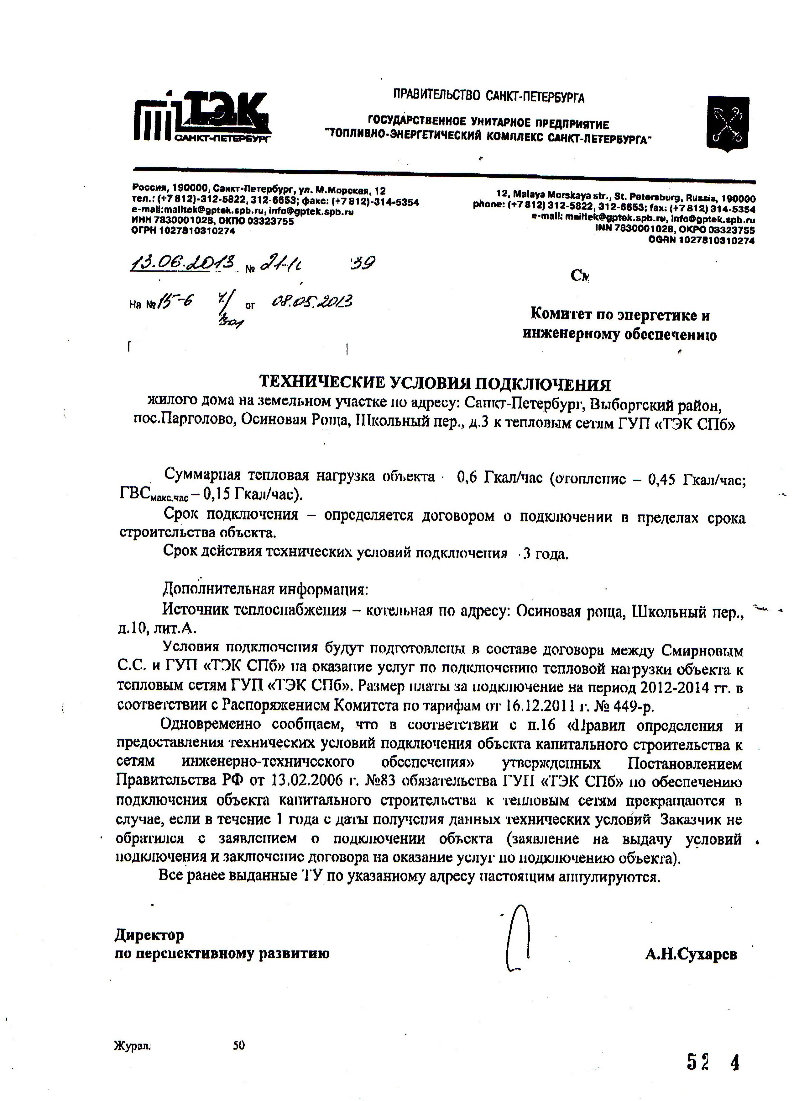Технические условия (ТУ) на электро-водо-теплоснабжение получены в 2013 году.