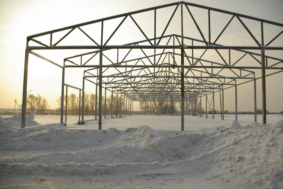 - На участке: металоконструкция S=1440 м2, высота - 6 м -под конёк. В центре конструкции есть канализационный люк (ливнёвка).