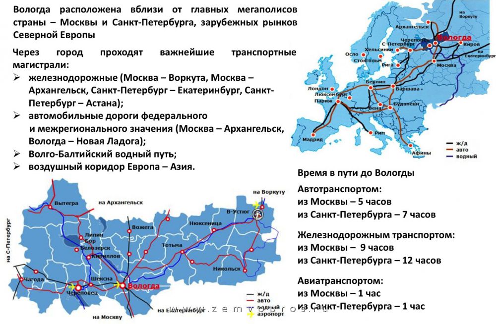 Вологда также и крупный транспортный центр. Находится на пересечении важных автомобильных, железнодорожных и водных путей.