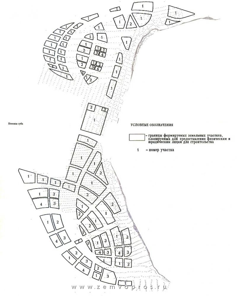Два земельных участка (северный и южный) площадью 47 955,0 м2 и 77 032,0 м2 для размещения объектов жилой и общественной застройки на Невской Губе в Санкт-Петербурге.