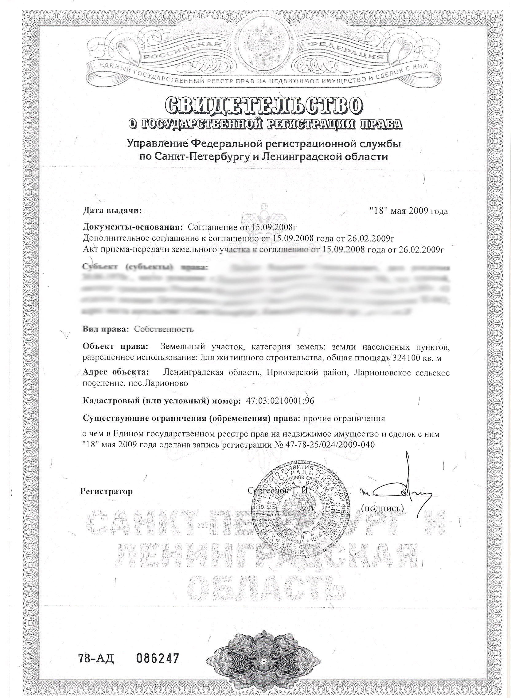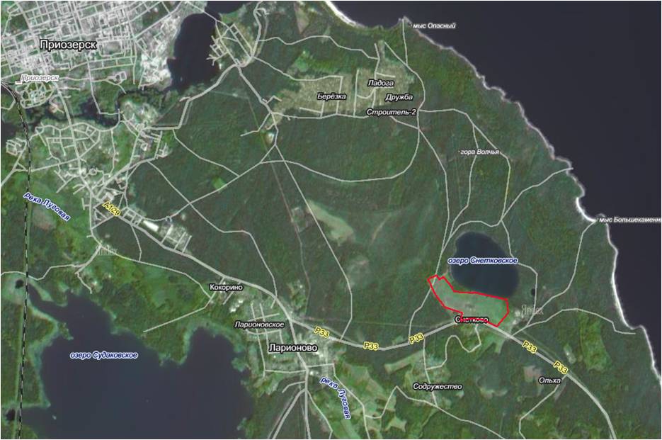 Земельный участок площадью 34 га для жилищного строительства на берегу Снетковского озера в посёлке Снетково в Приозерском районе.