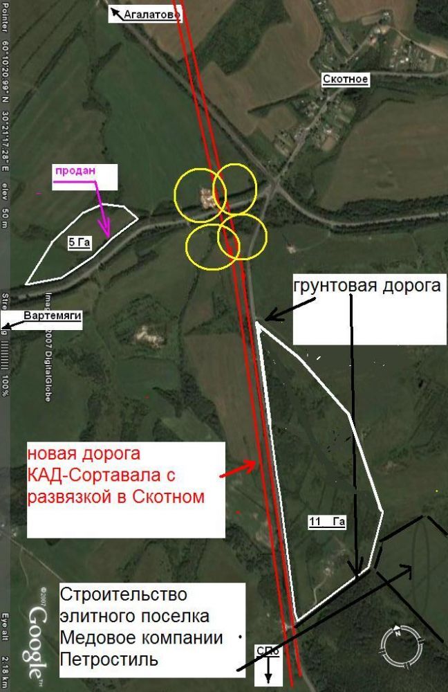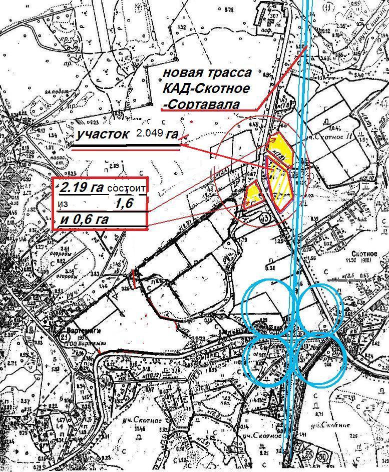 - Участок площадью 2.19 Га и часть участка («нос» участка ) площадью 11 га , примыкающая к развязке, имеют съезд на новую трассу КАД-Скотное-Приозерск-Сортавала.