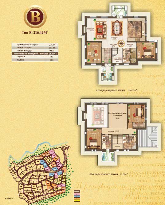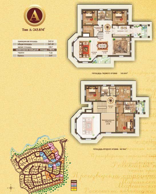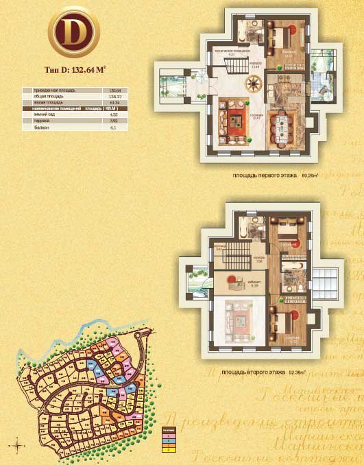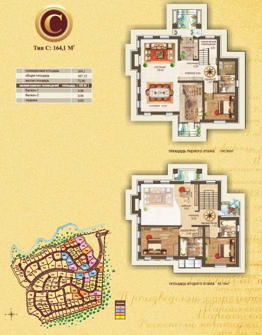 - Предлагаются на выбор 4 типа (А,В,С,Д) коттеджей с прилегающими участками от 8 до 20 соток площадью: