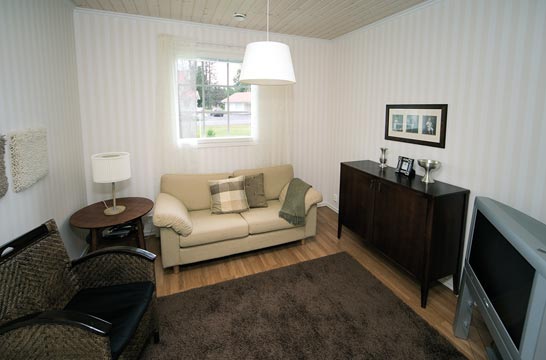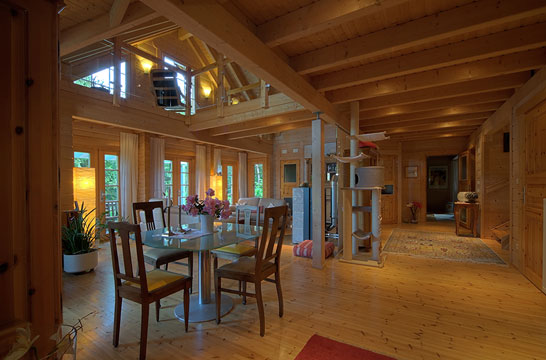 Внутренняя отделка так же, как и наружная, зависит от пожеланий заказчика. Как правило, внутренние перегородки сконструированы по аналогии с внешними стенами, содержат минераловатный утеплитель 100 мм для достижения шумоизоляции и обшиты гипсокартоном, что дает идеальные поверхности для высококлассной отделки помещений.