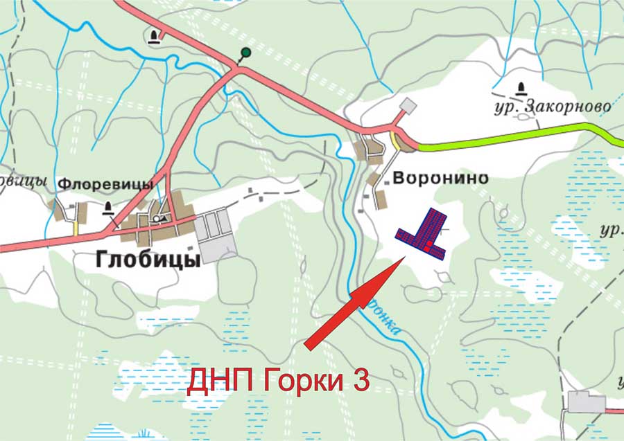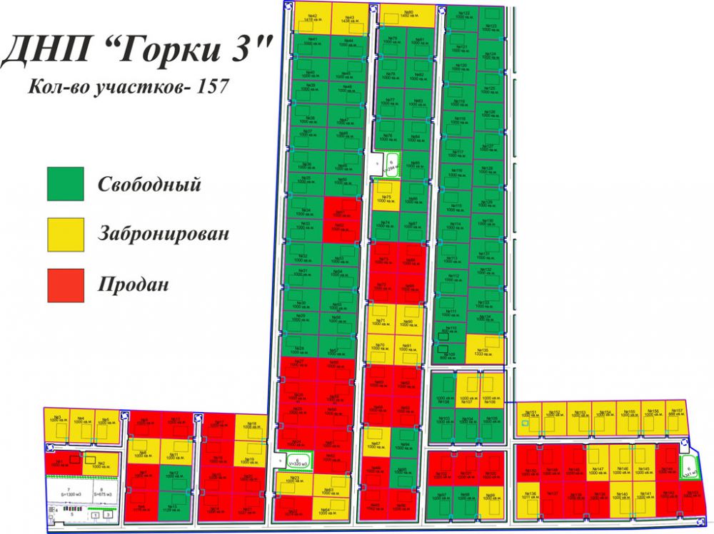 - ДНП "Горки-3" - новое дачное некоммерческое партнерство. Общее число участков - 157. К продаже предложены 42 участка. На Генплане выделены зелёным цветом.