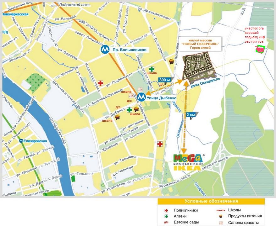 - В 2 км к югу от участка располагается торгово-развлекательный комплекс «МЕГА-ДЫБЕНКО».