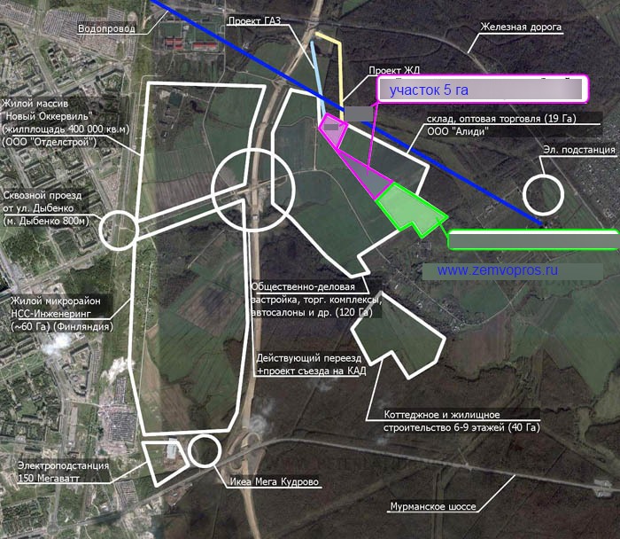- Участок расположен в месте пересечения КАД (восточная граница участка) с дорогой «Кудрово - Новосергиевка» (северная граница).