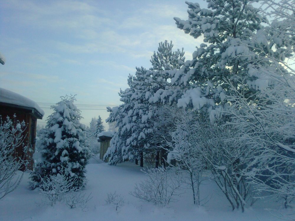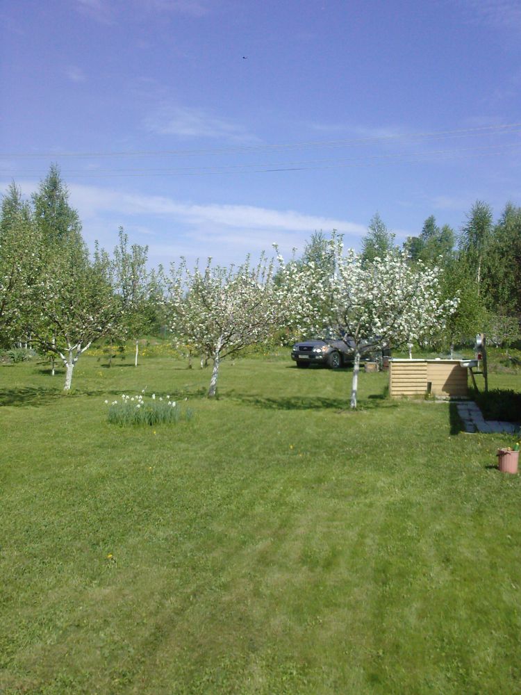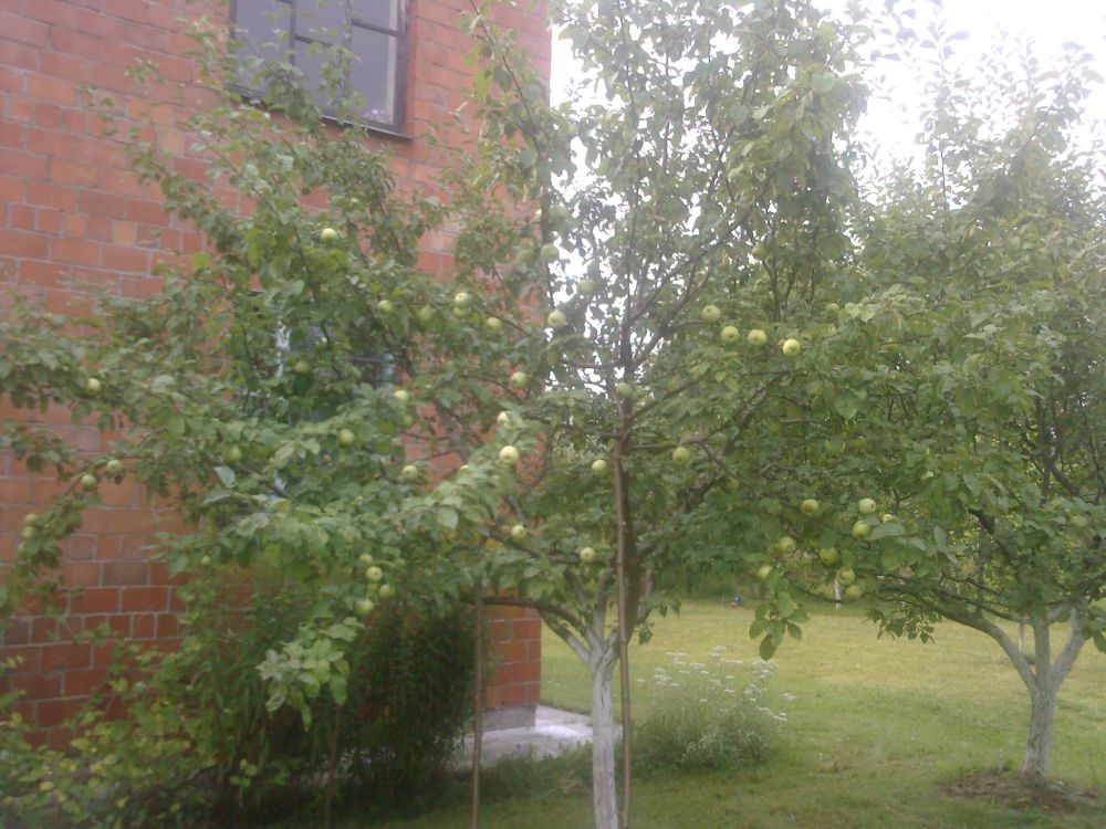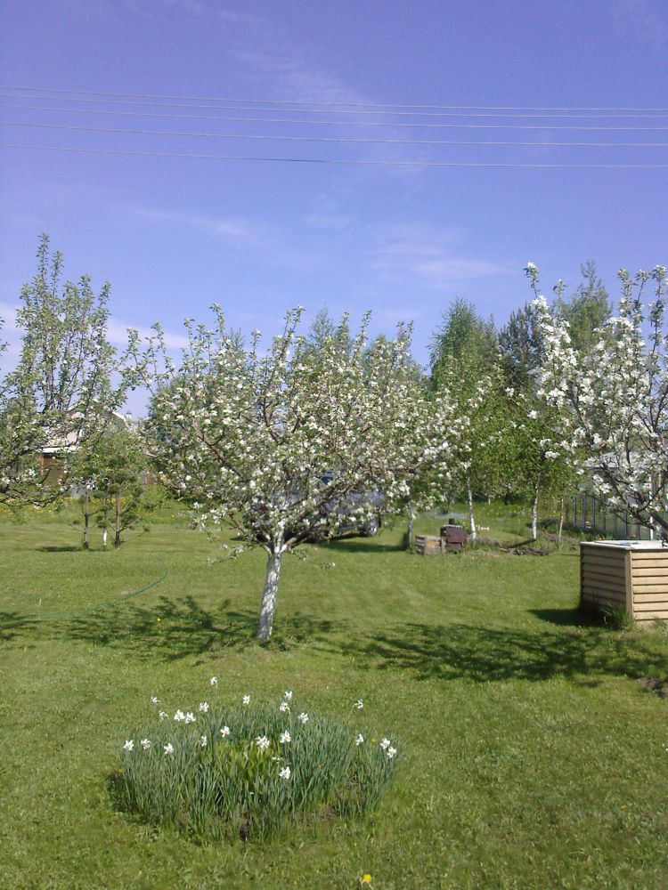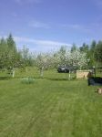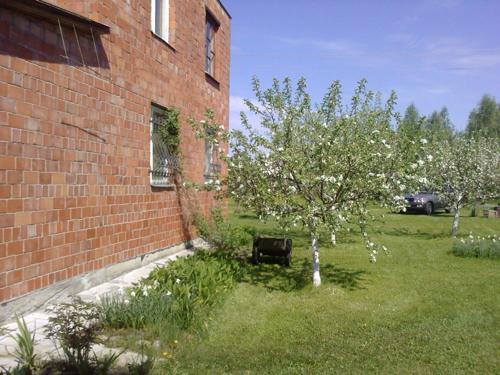 - Ландшафтный дизайн участка: газон, парник, стриженые сосны, берёзы, культивированные яблони.